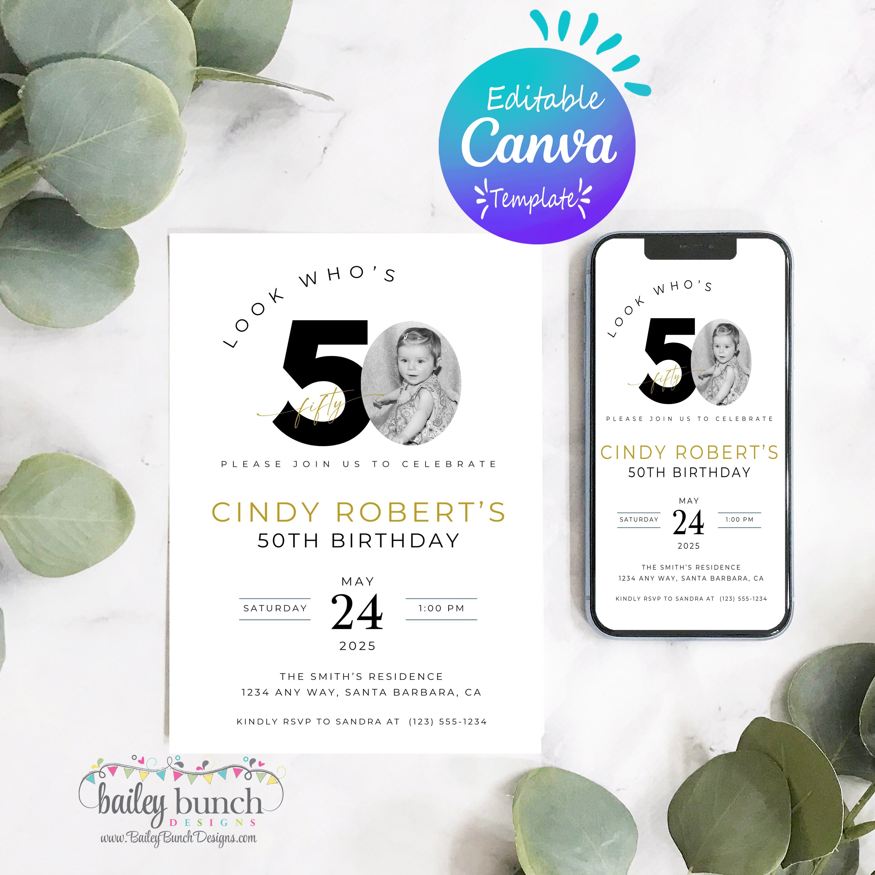 Celebrate your 50th birthday in style with our simple modern and minimalist invitation Template. Super quick and easy to edit, allowing you to plan the perfect fiftieth birthday bash. The template is sized 5x7 inches and is fully editable in Canva which allows you to personalize every detail, creating a customized invitation that reflects your unique taste.