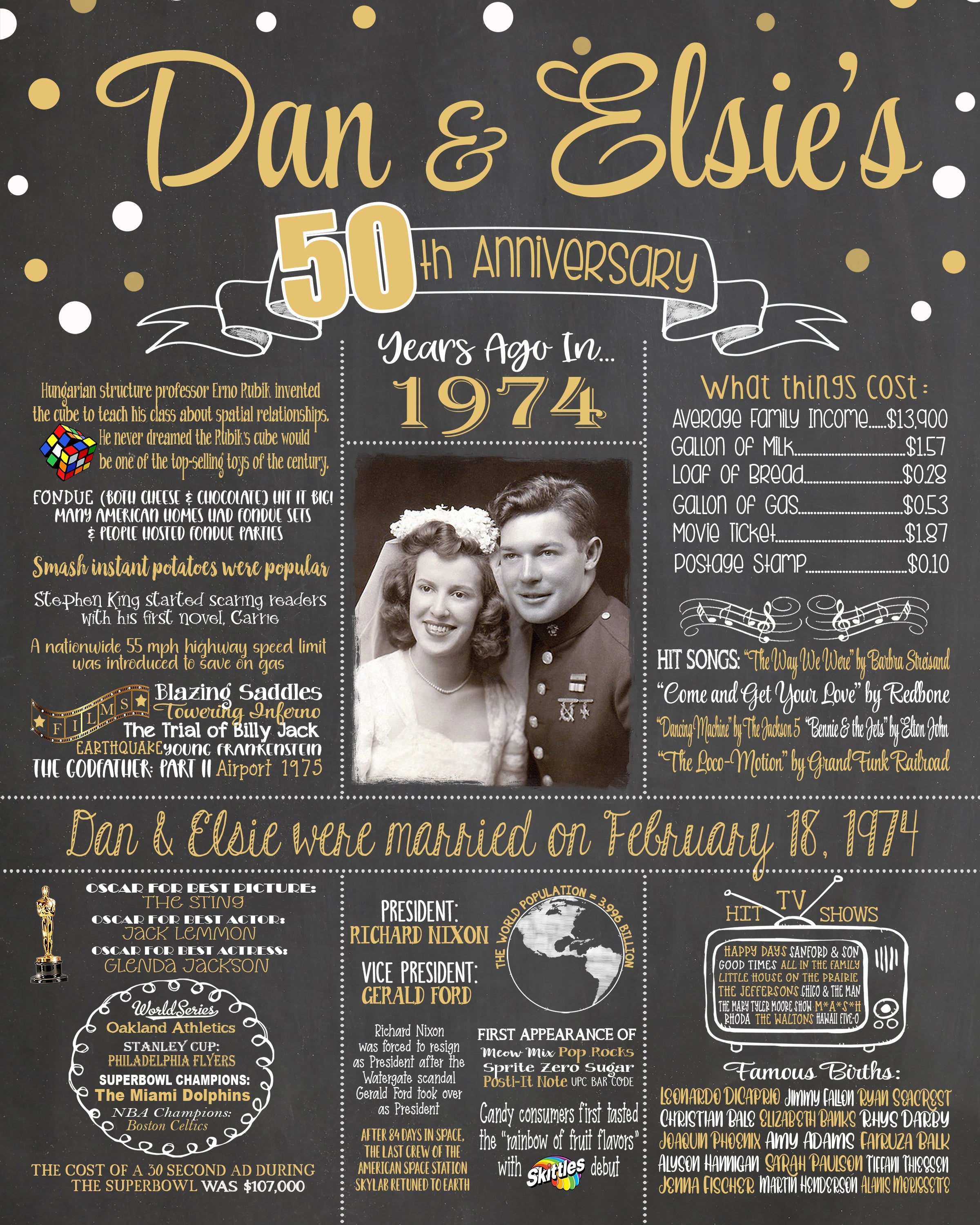 Unique & Fun 50th Wedding Anniversary Chalkboard Sign with photo - 1974 Anniversary Board
