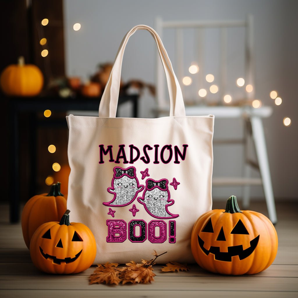 BOO Faux Embroidery Pink Ghost TRICK OR TREAT BAGS FOR HALLOWEEN