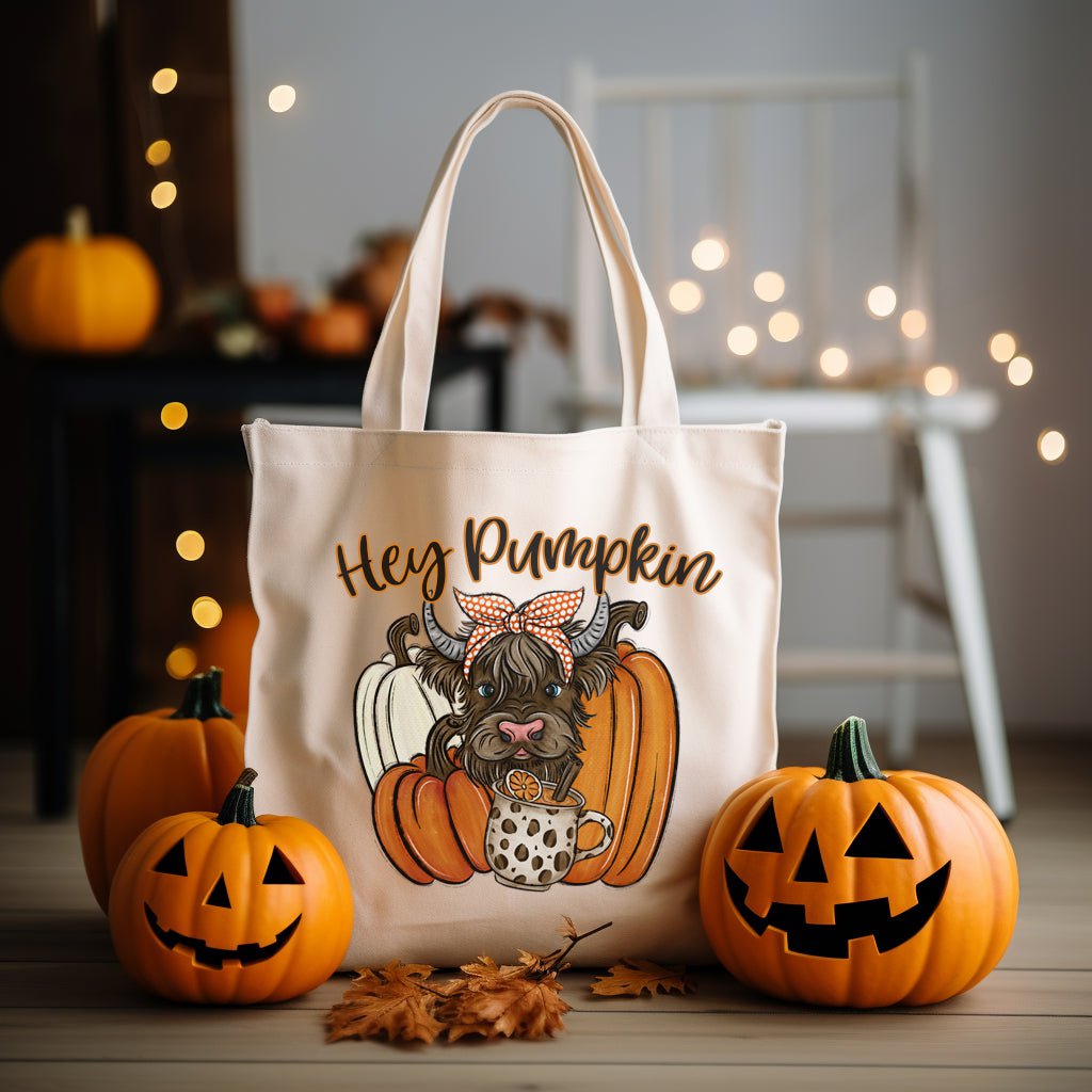 HEY PUMPKIN HIGHLAND COW TOTE BAGS