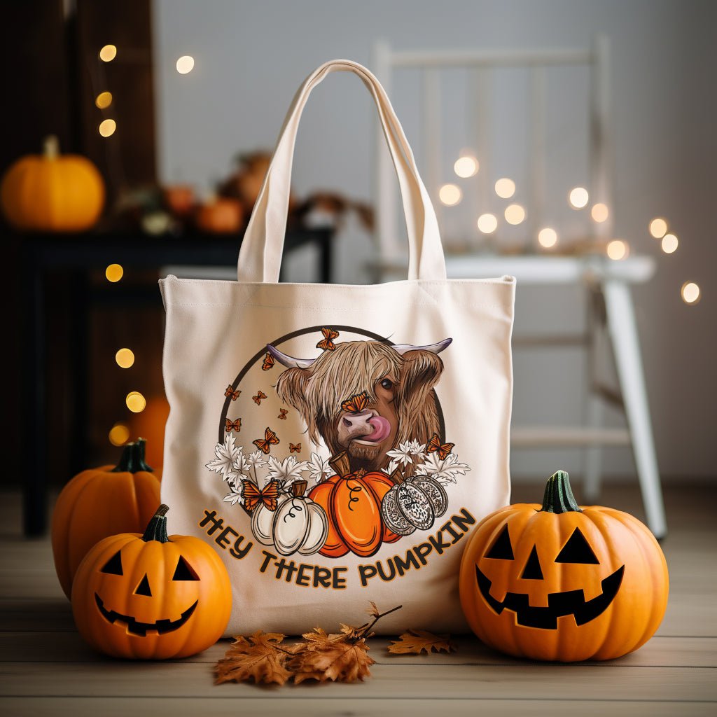 HEY THERE PUMPKIN HIGHLAND COW TOTE BAGS