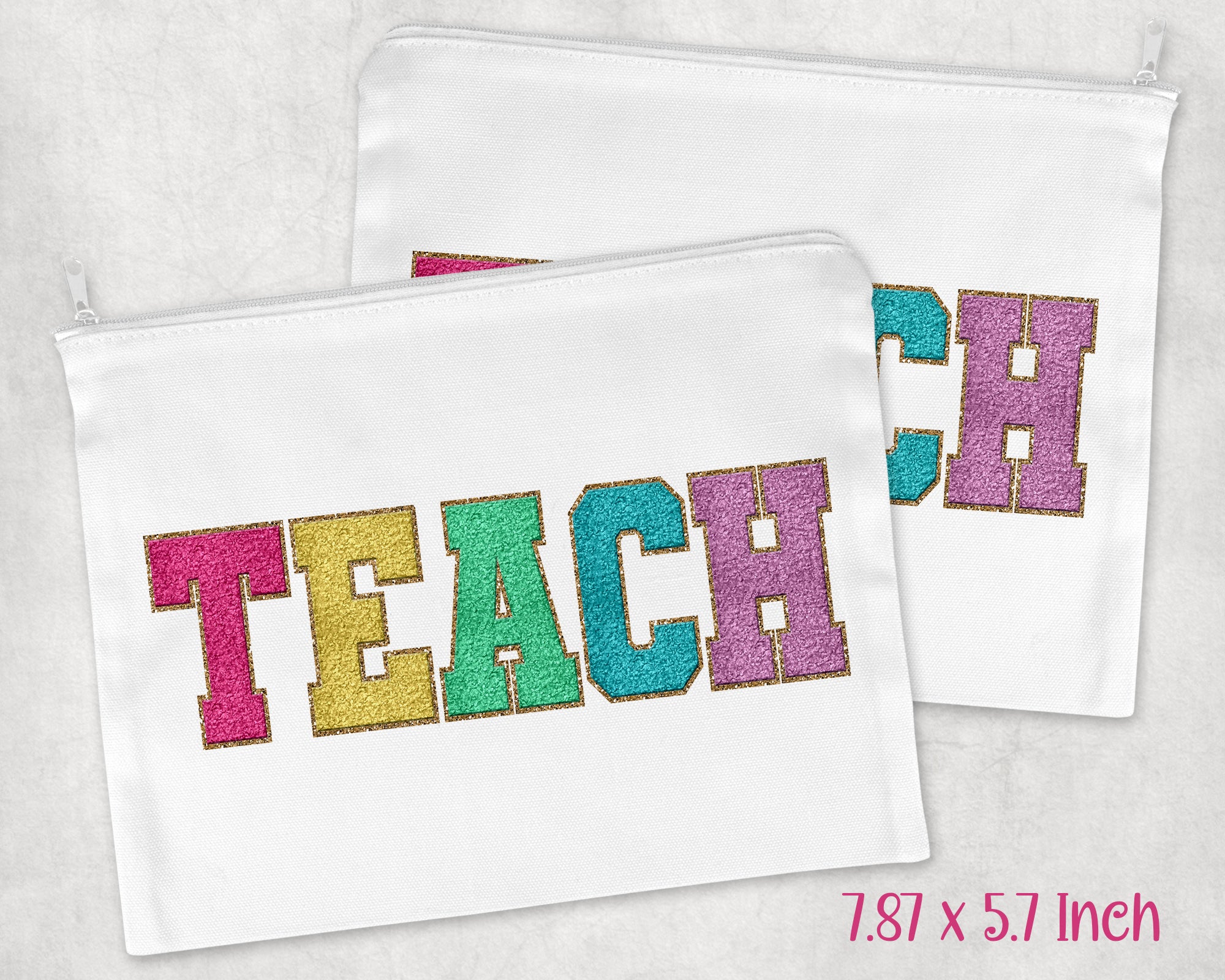 The CUTEST Personalized cosmetic bag for Teacher Appreciation with Sublimated TEACH in Faux Chenille Varsity Patch Letters!