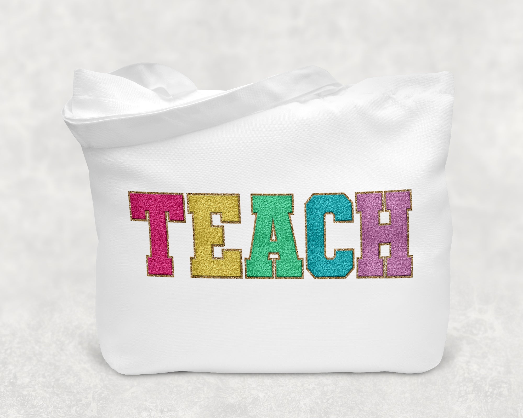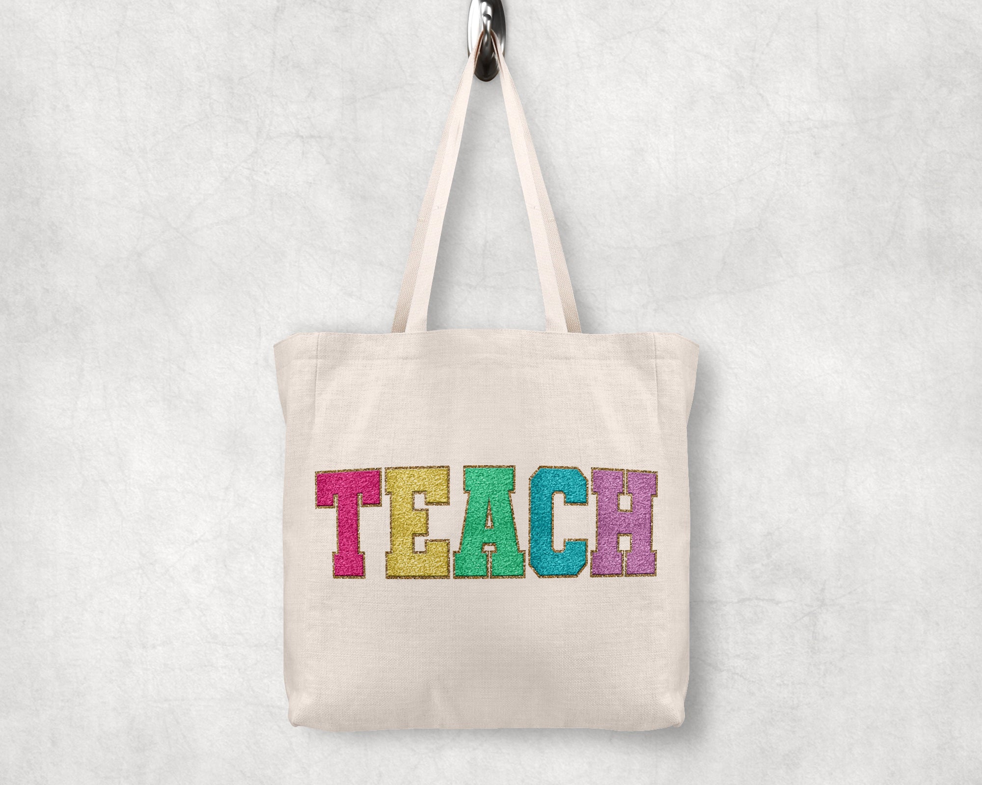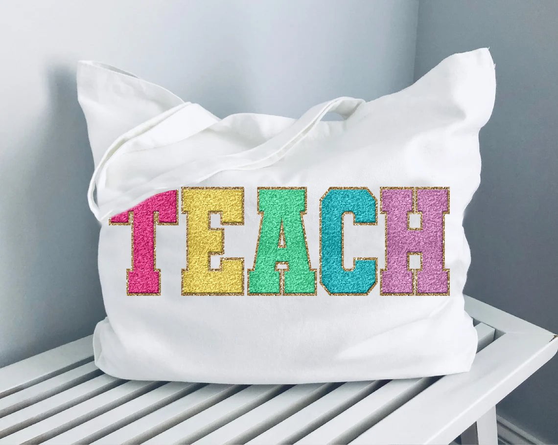 The CUTEST Personalized Tote for Teacher Appreciation with Sublimation TEACH in Faux Chenille Varsity Patch Letters!