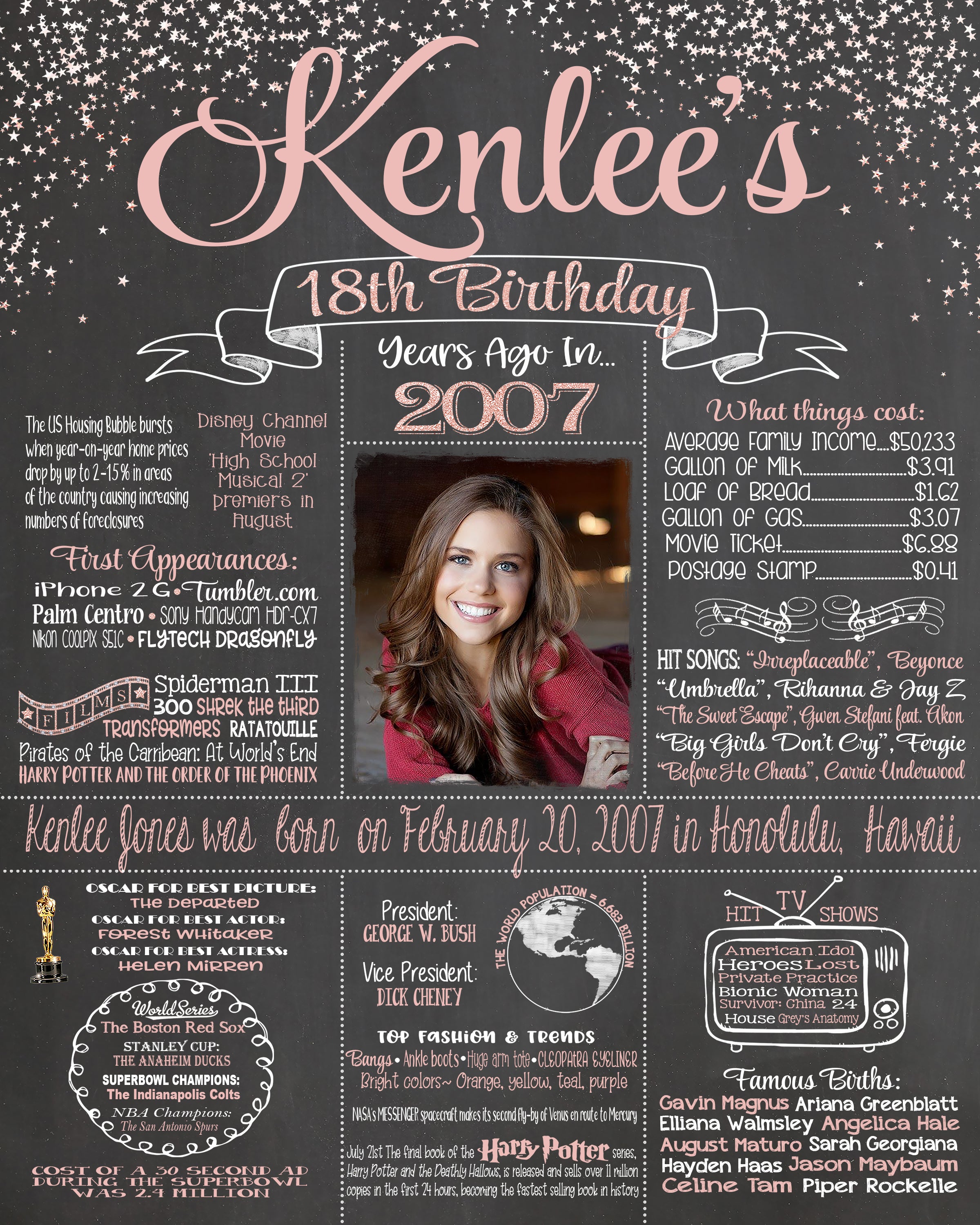 color (you choose one color in addition to white), the name on the top, name, date of birth and birth place for the middle of the poster***