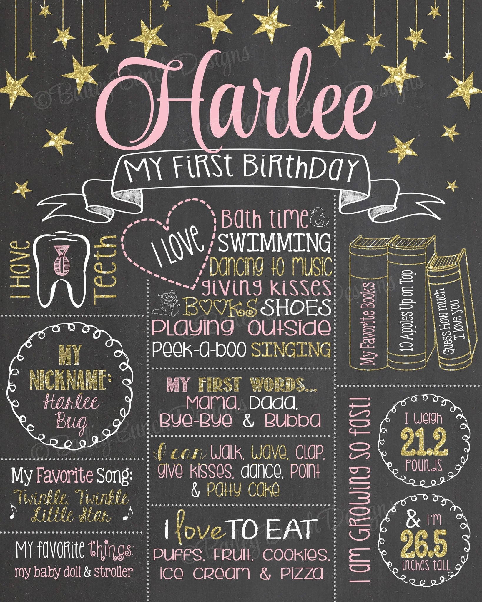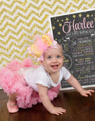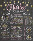 Your chalkboard can be printed at most local photo print shops: walgreens, walmart, staples, fedex kinkos, office depot, etc The file may be printed on card stock or regular paper and then mounted onto foam board or placed in a frame. Most office supply stores will print the poster and mount it on foam board for you! The ways of presenting your child's first birthday poster are endless: you could frame it, mount it on a foam board, print it on a canvas, or even share it digitally on facebook or thru email.