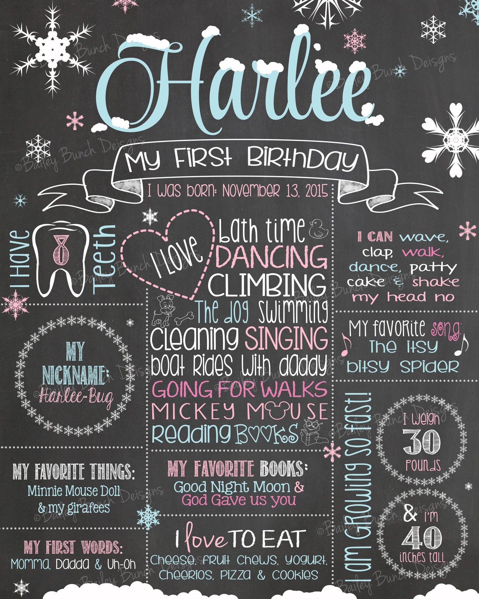 Your chalkboard can be printed at most local photo print shops: walgreens, walmart, staples, fedex kinkos, office depot, etc The file may be printed on card stock or regular paper and then mounted onto foam board or placed in a frame. Most office supply stores will print the poster and mount it on foam board for you! The ways of presenting your child's first birthday poster are endless: you could frame it, mount it on a foam board, print it on a canvas, or even share it digitally on facebook or thru email.