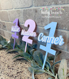 Celebrate your child’s birthday with a custom acrylic cake topper featuring their name and age — perfect for first birthdays, smash cakes, and kids’ parties up to age 9. Available for ages 1–9