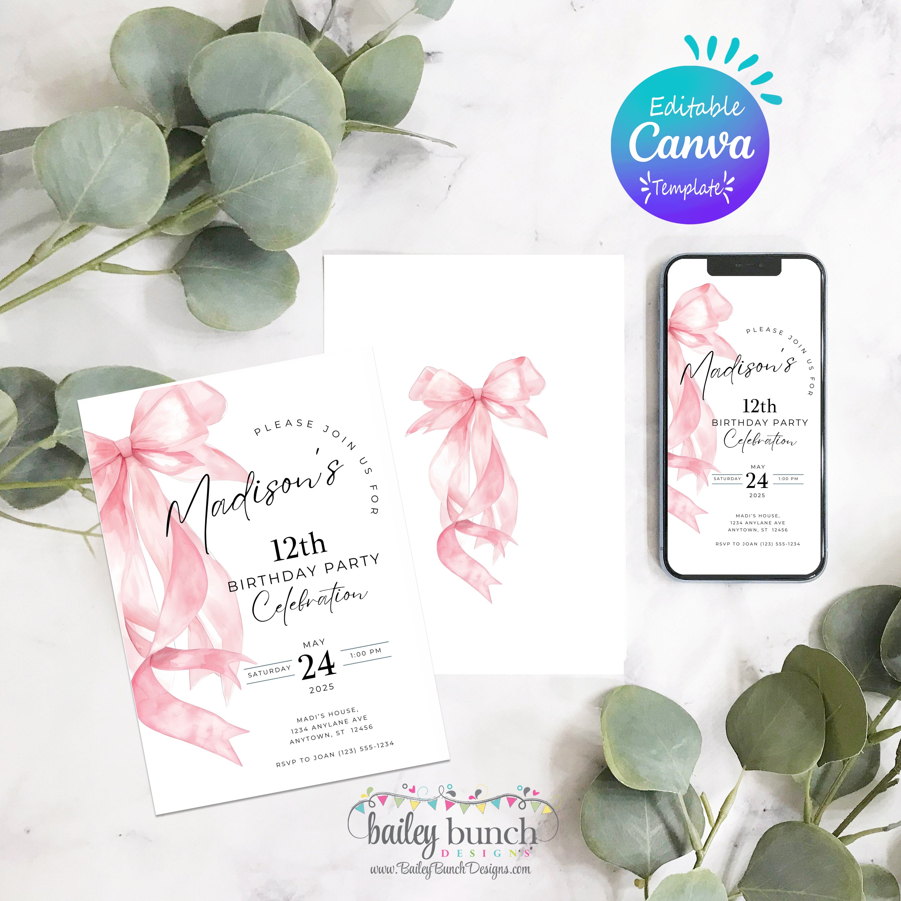 π Personalized Pink Bow Tween Birthday Invitation π ANY AGE! Editable Template | 5x7" JPG, PDF, Double Sided, Back Design & phone invite included!