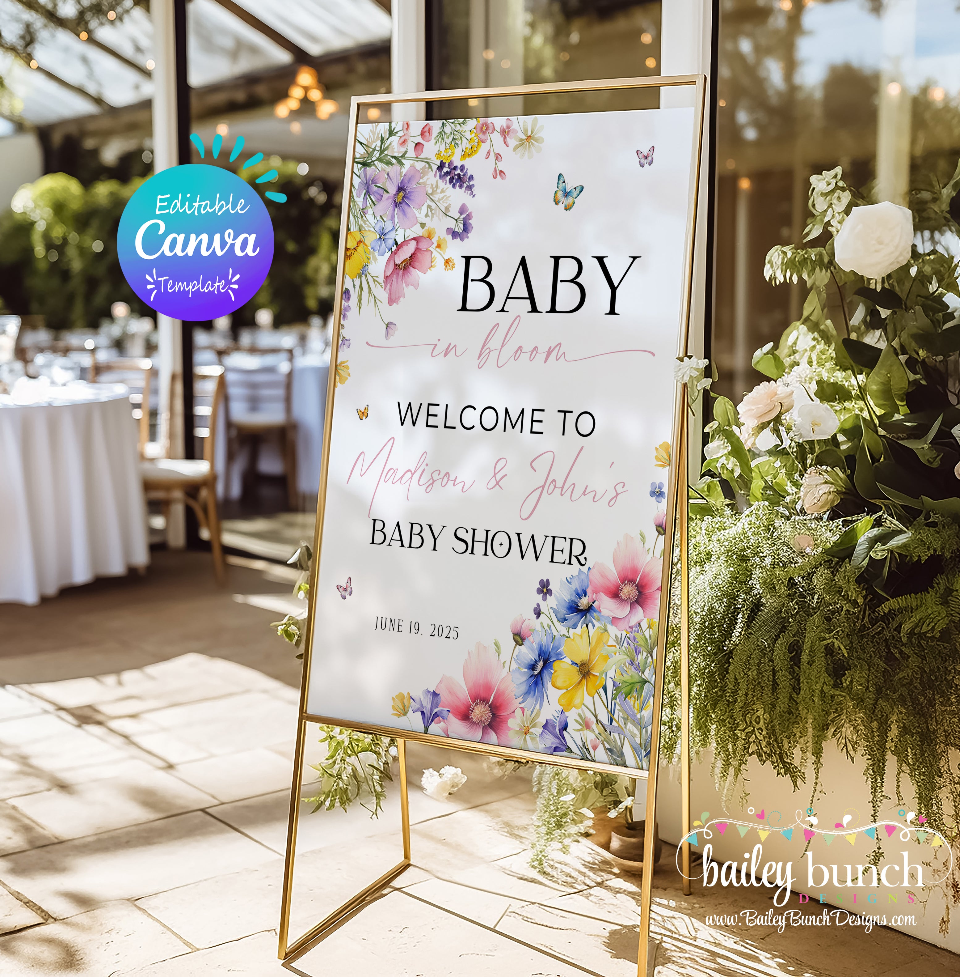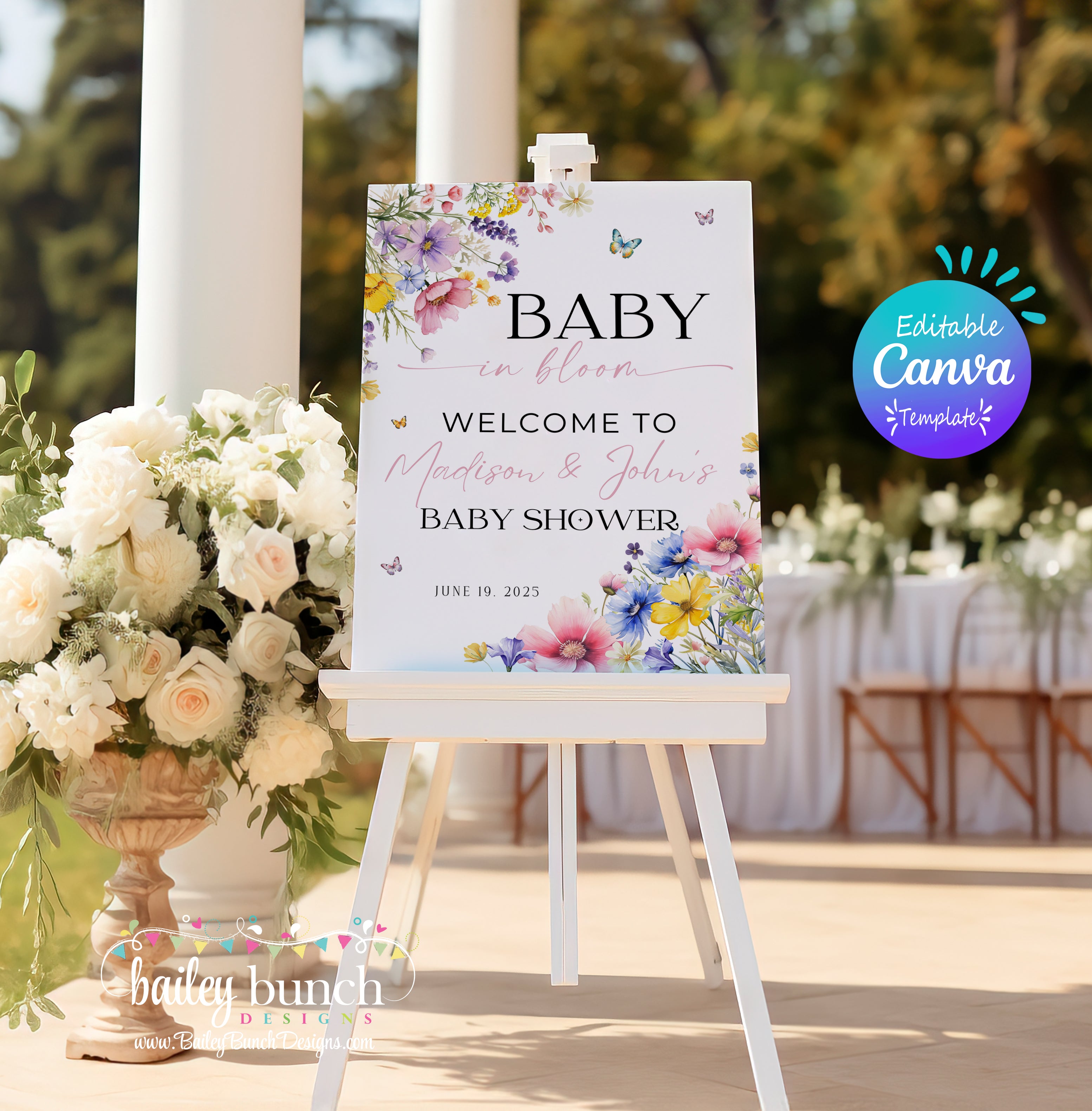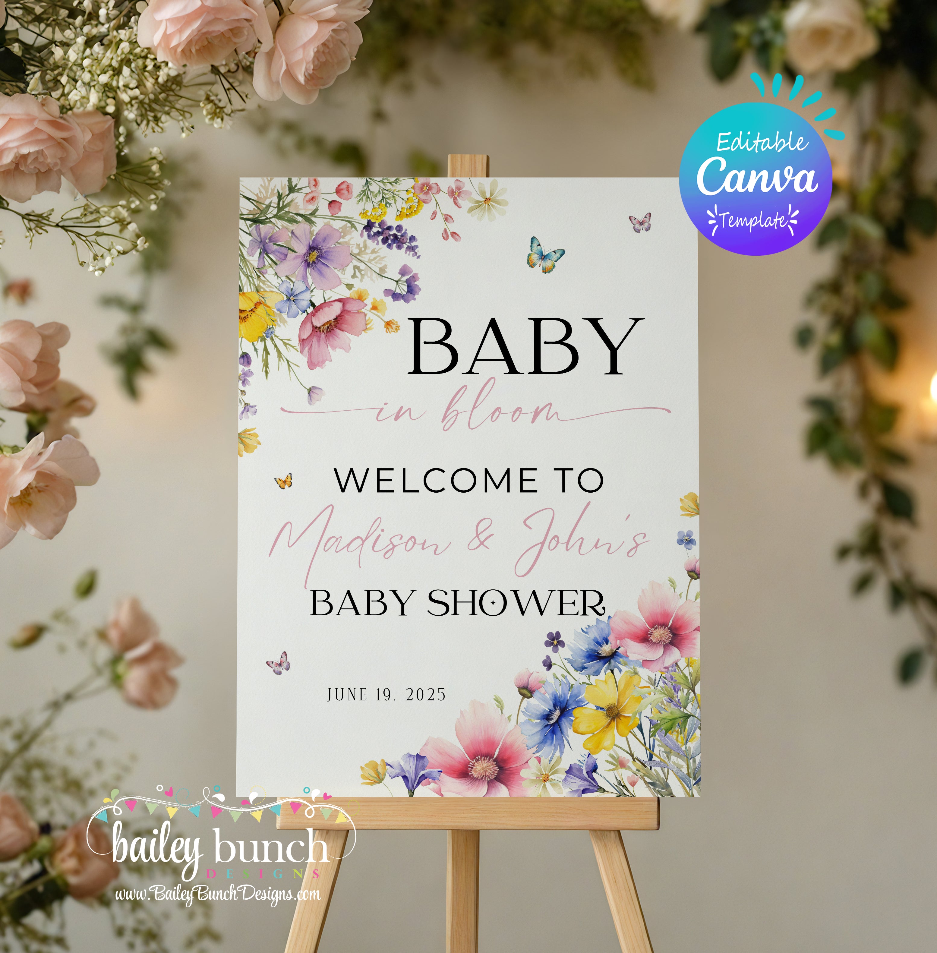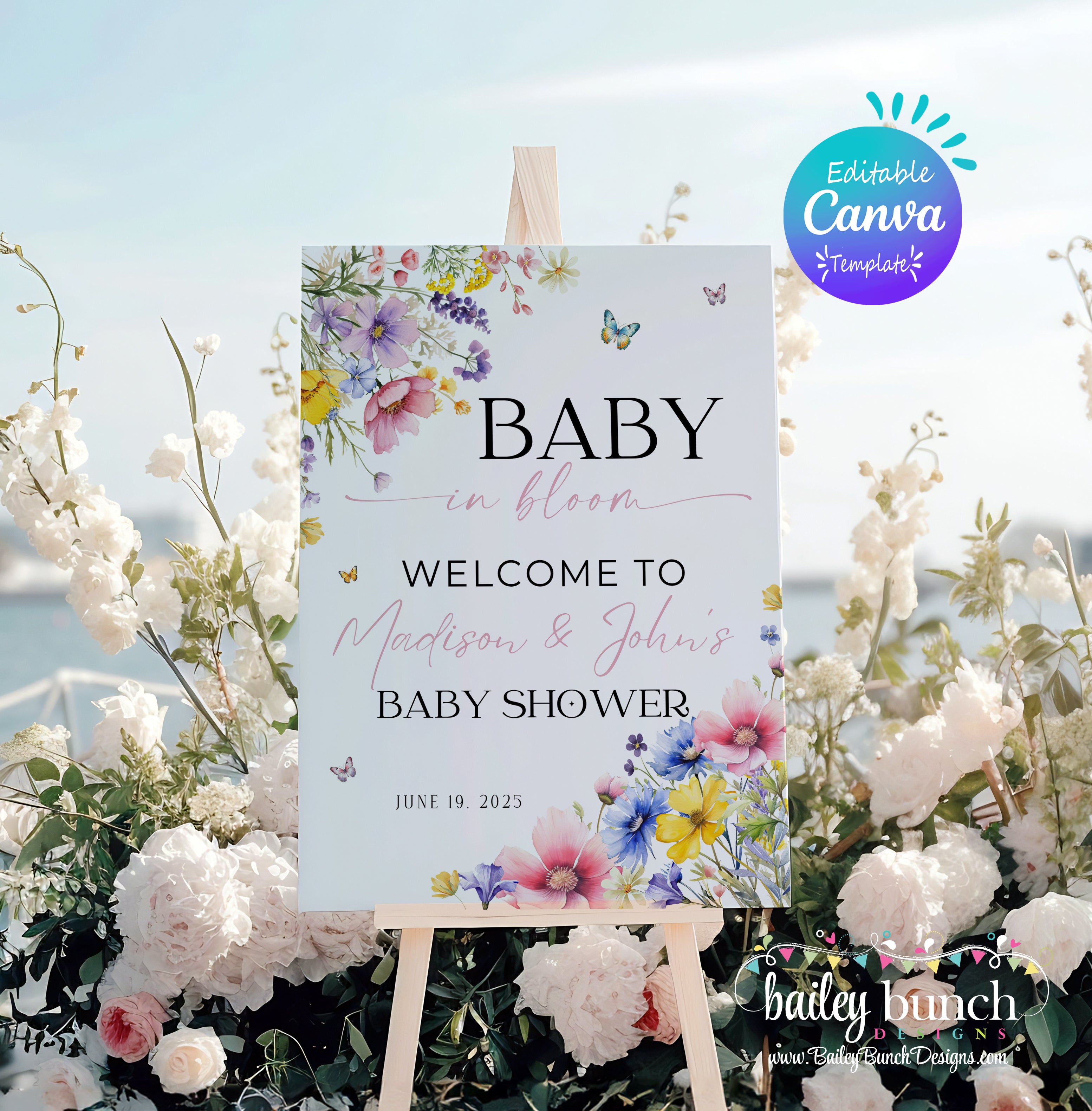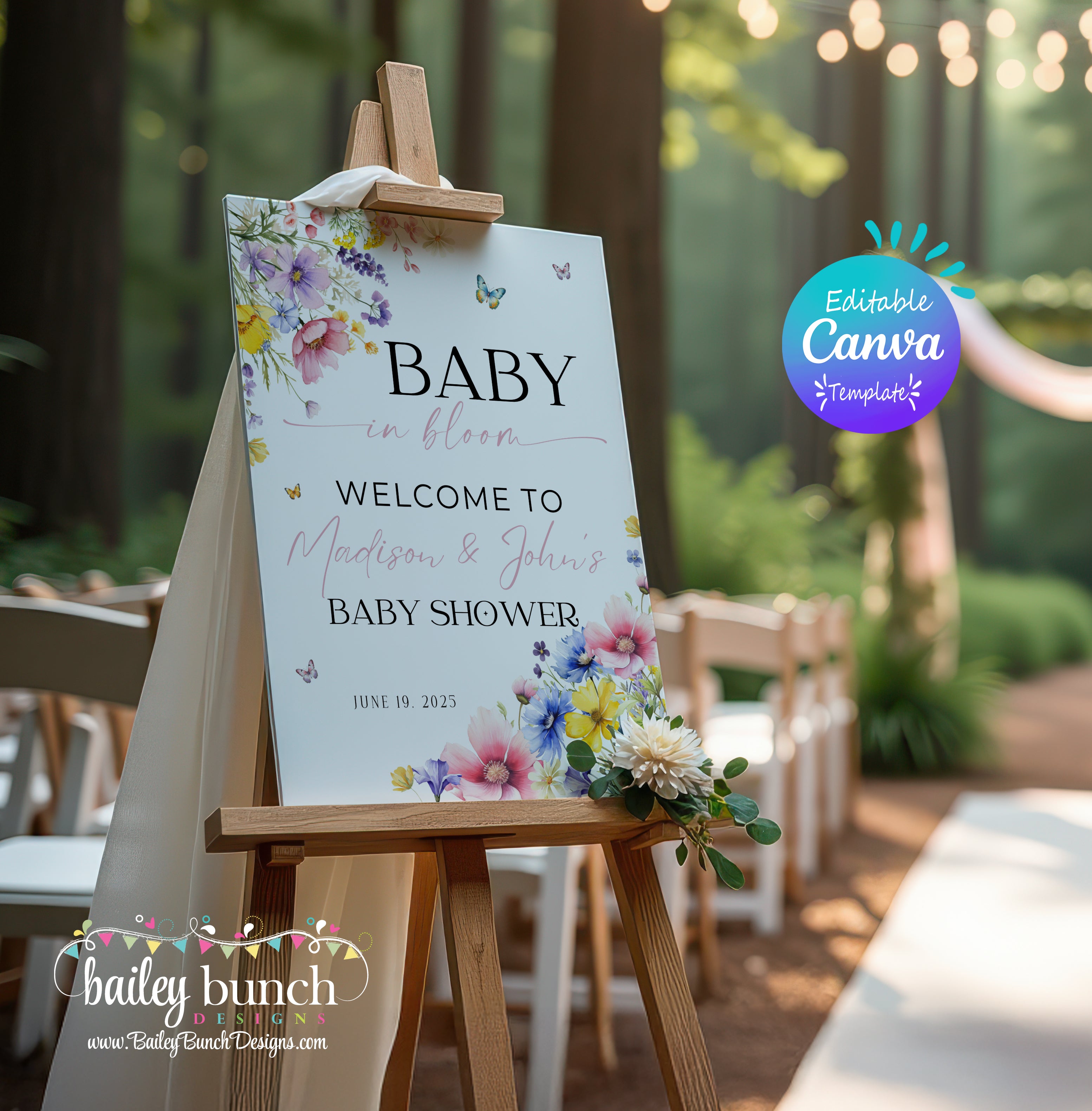 Welcome your guests in style to our Baby In Bloom Wildflower editable baby shower welcome sign, designed to brighten up your special day with a touch of spring with watercolor wildflowers and elegant font. With its delightful wildflower theme, this sign is the perfect way to celebrate the arrival of your little one and ensure a memorable baby shower.