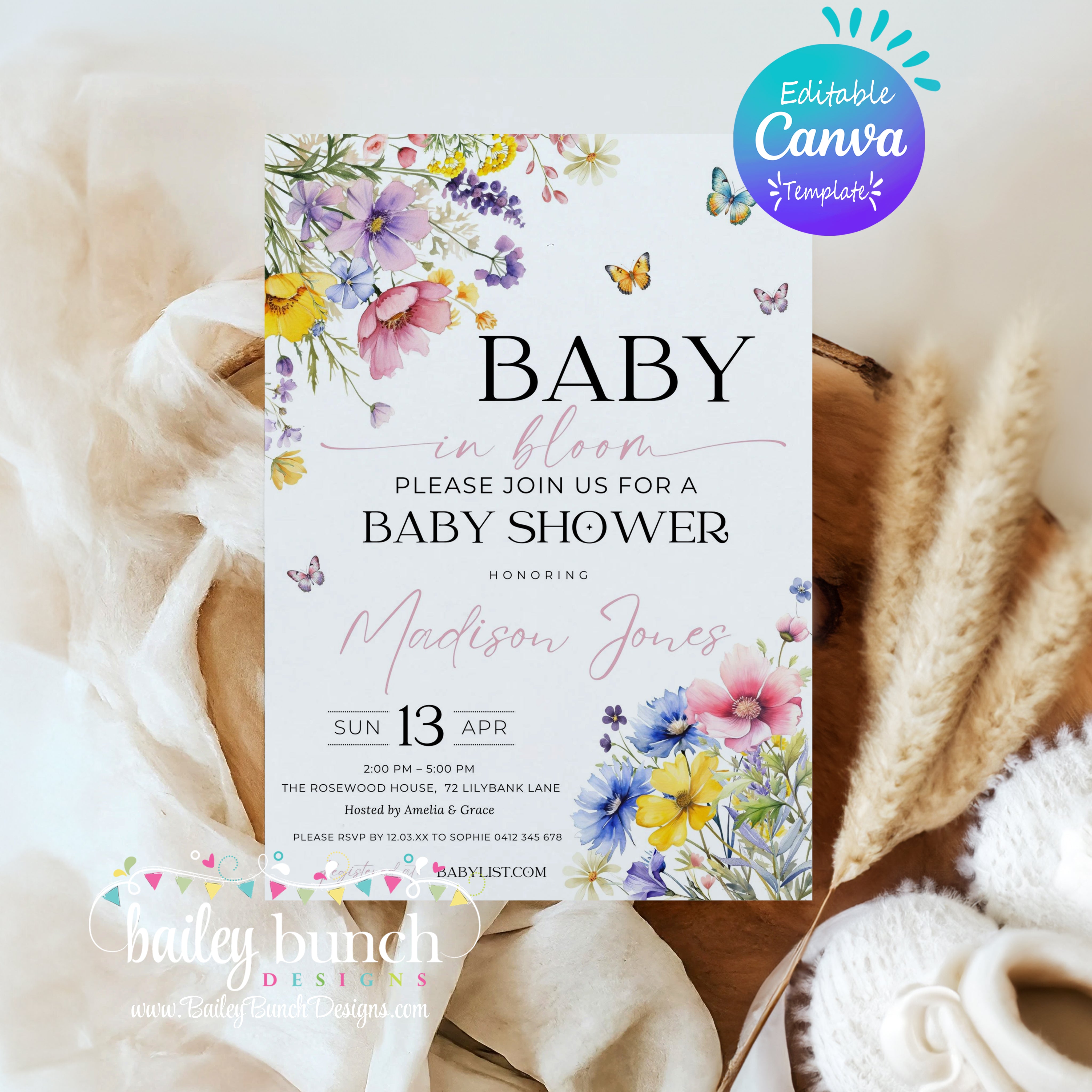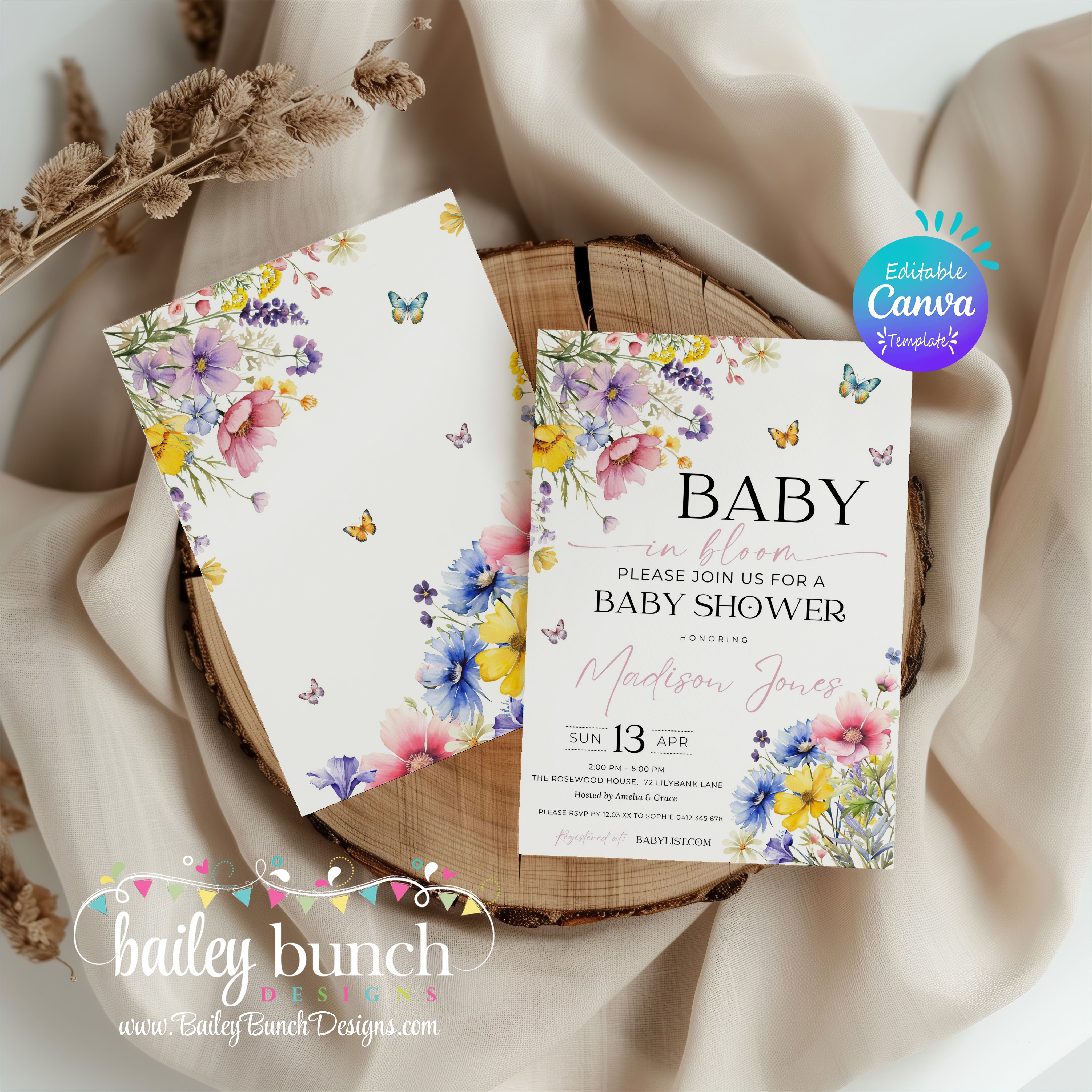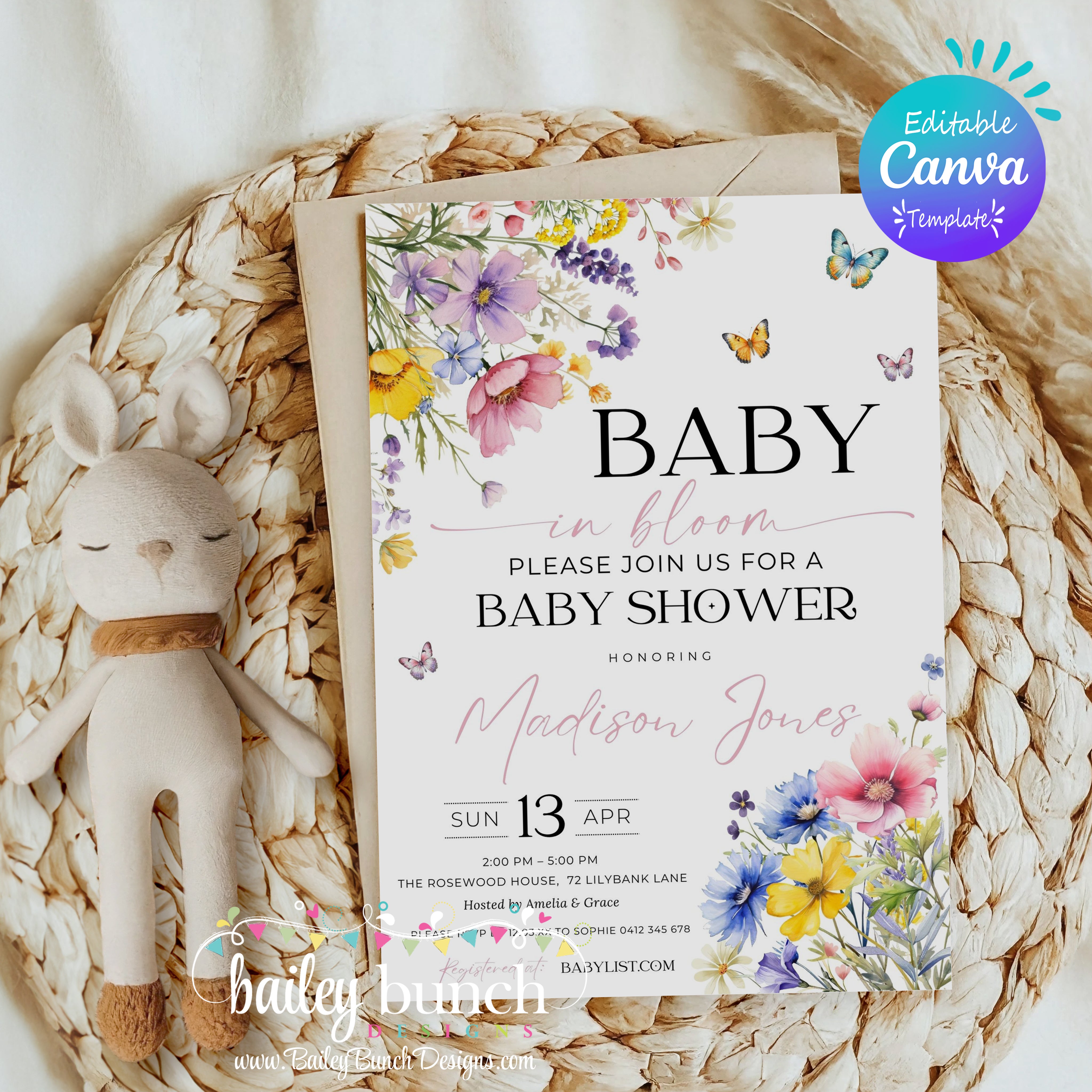 Introducing our Baby In Bloom Wildflower editable baby shower invitation, designed to brighten up your special day with a touch of spring with watercolor wildflowers and elegant font. This set features both 5x7 invitation and a mobile-friendly version, enabling you to effortlessly share the joyful news with friends and family. With its delightful wildflower theme, this invitation set is the perfect way to celebrate the arrival of your little one and ensure a memorable baby shower.