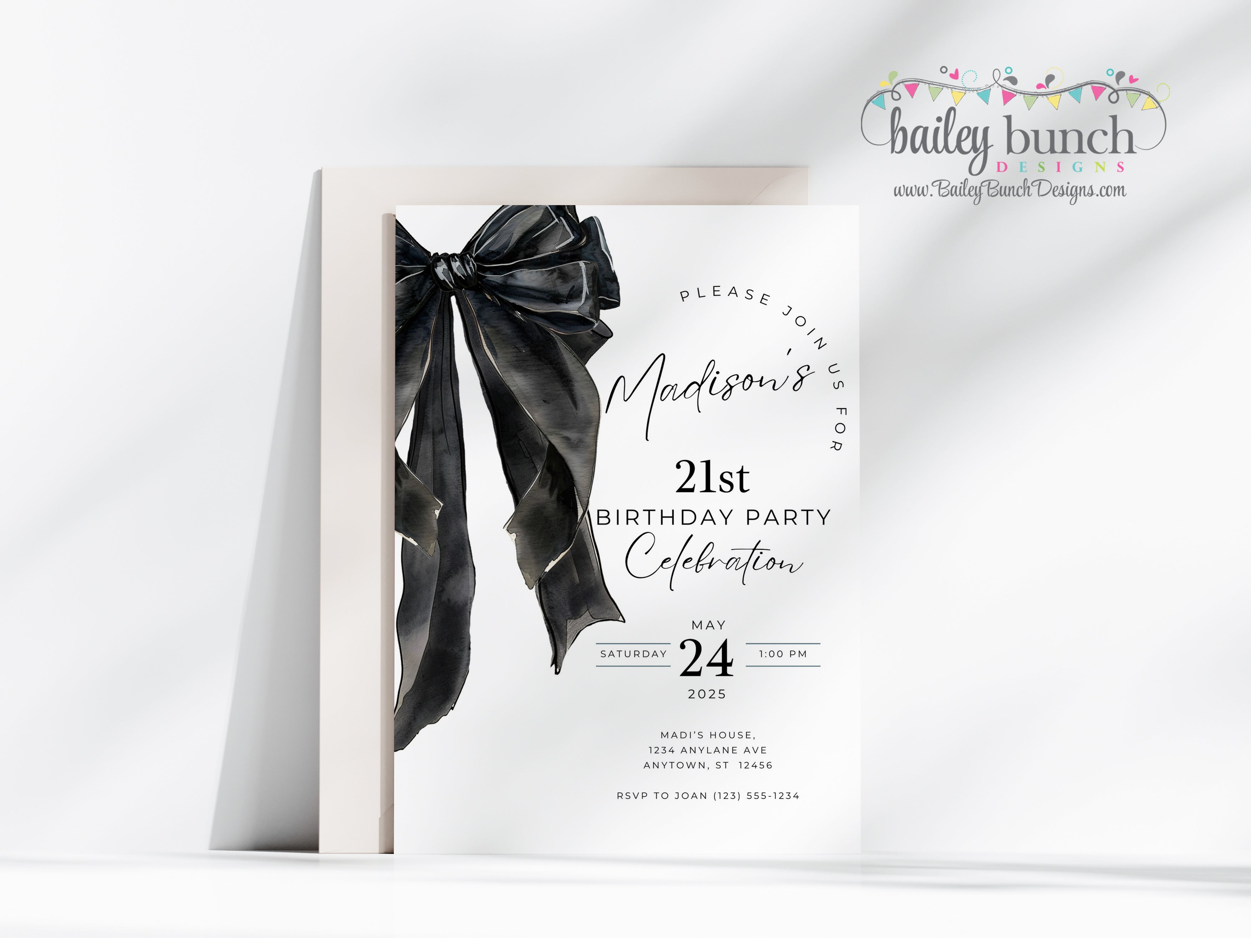 π Personalized Black Bow Birthday Invitation π ANY AGE! Editable Template | 5x7" JPG, PDF, Double Sided, Back Design & phone invite included!