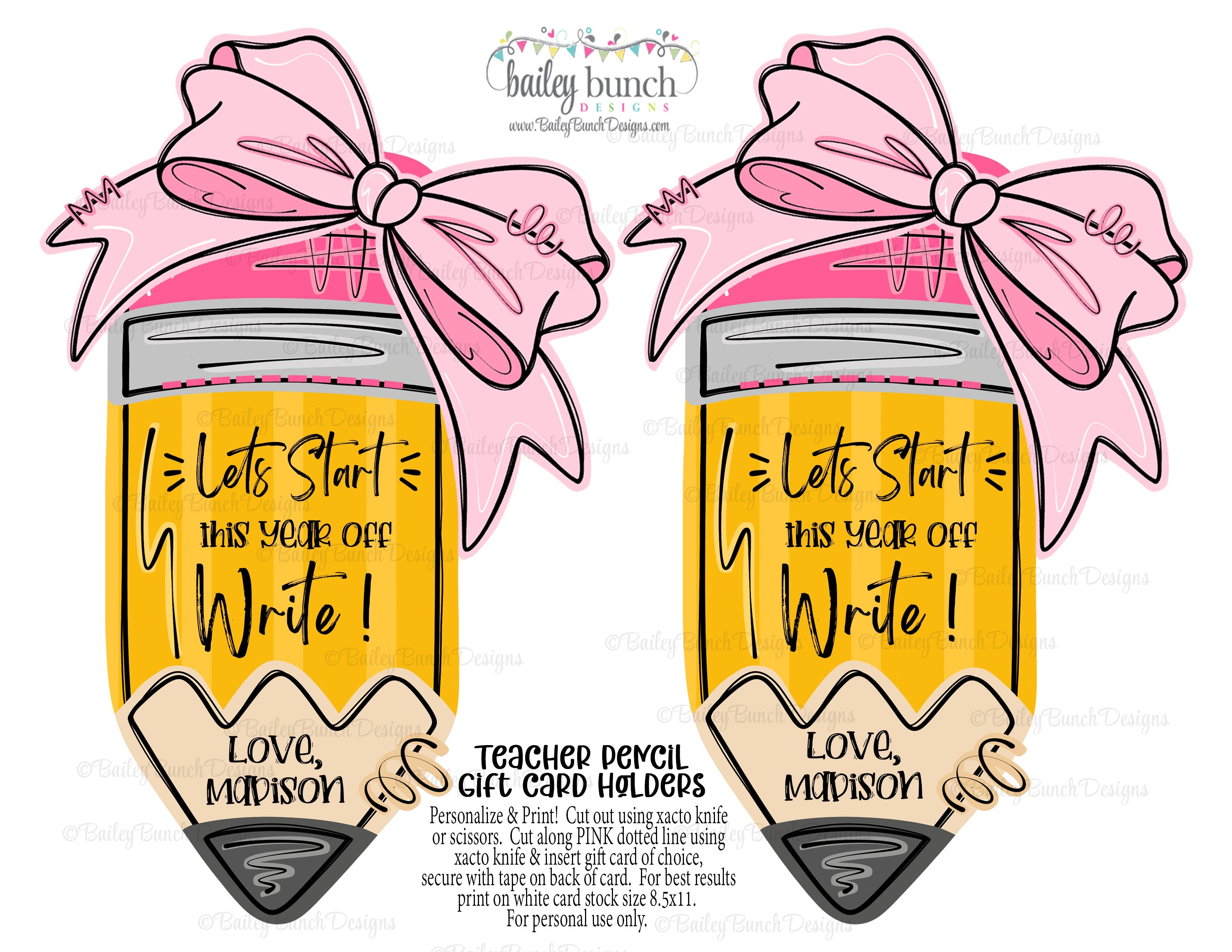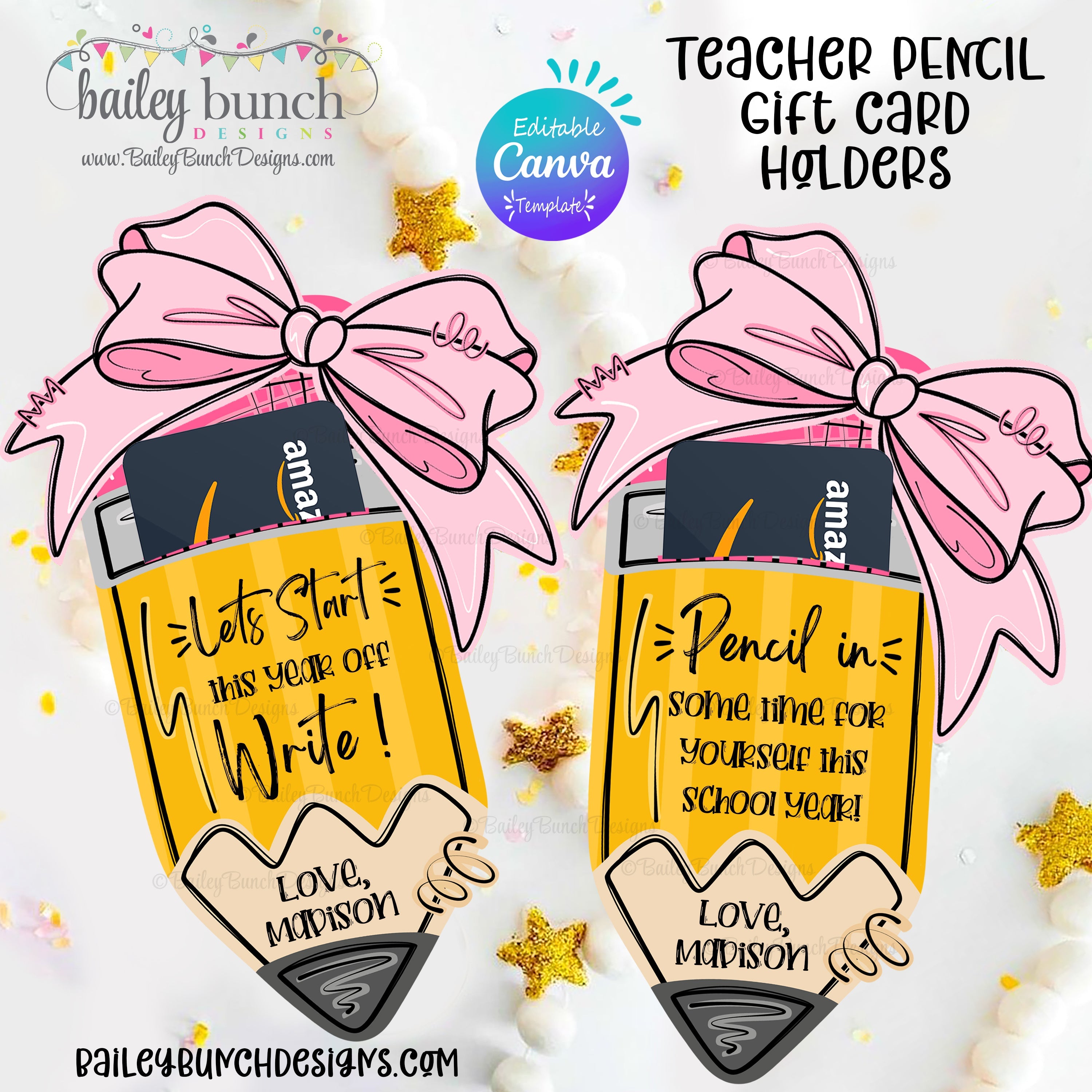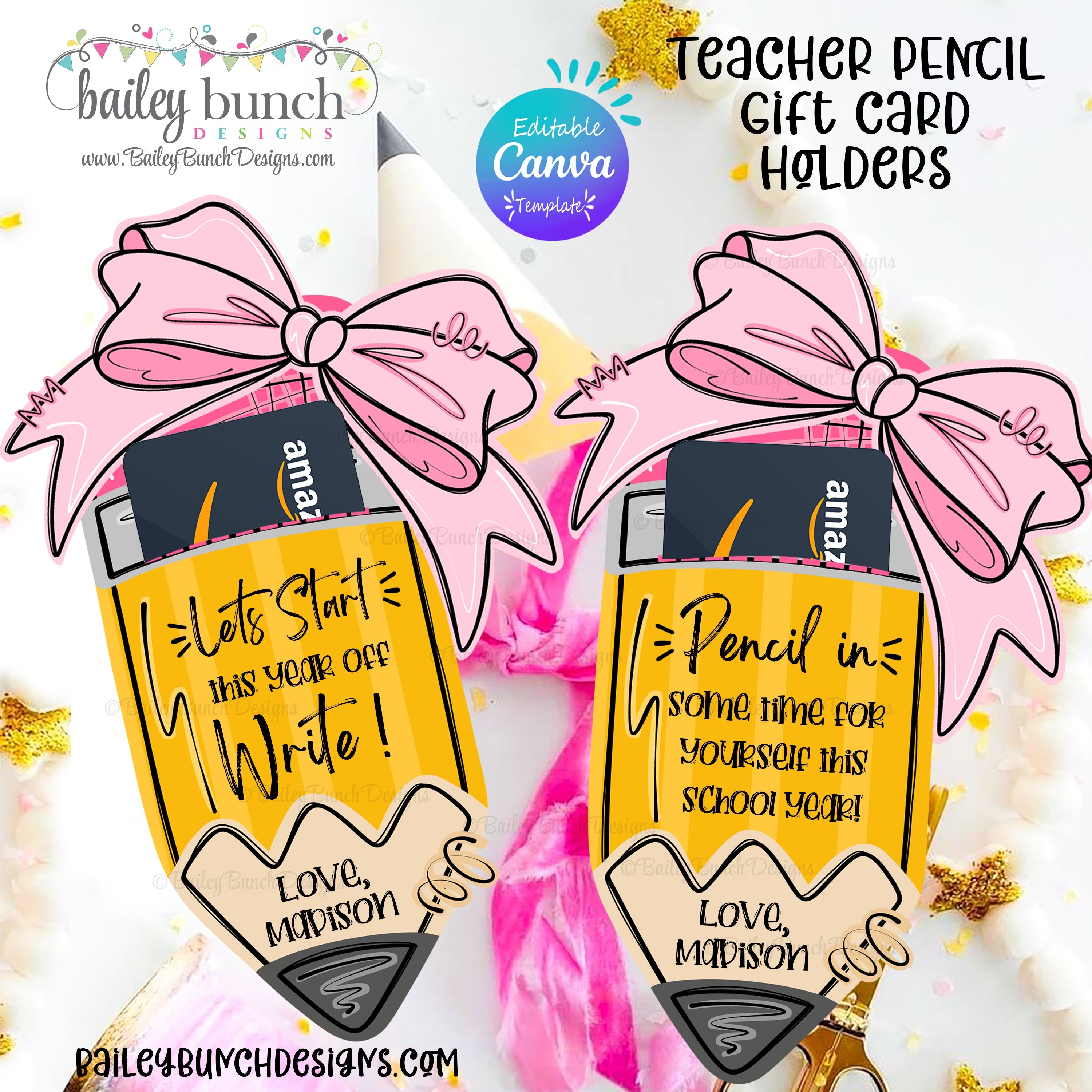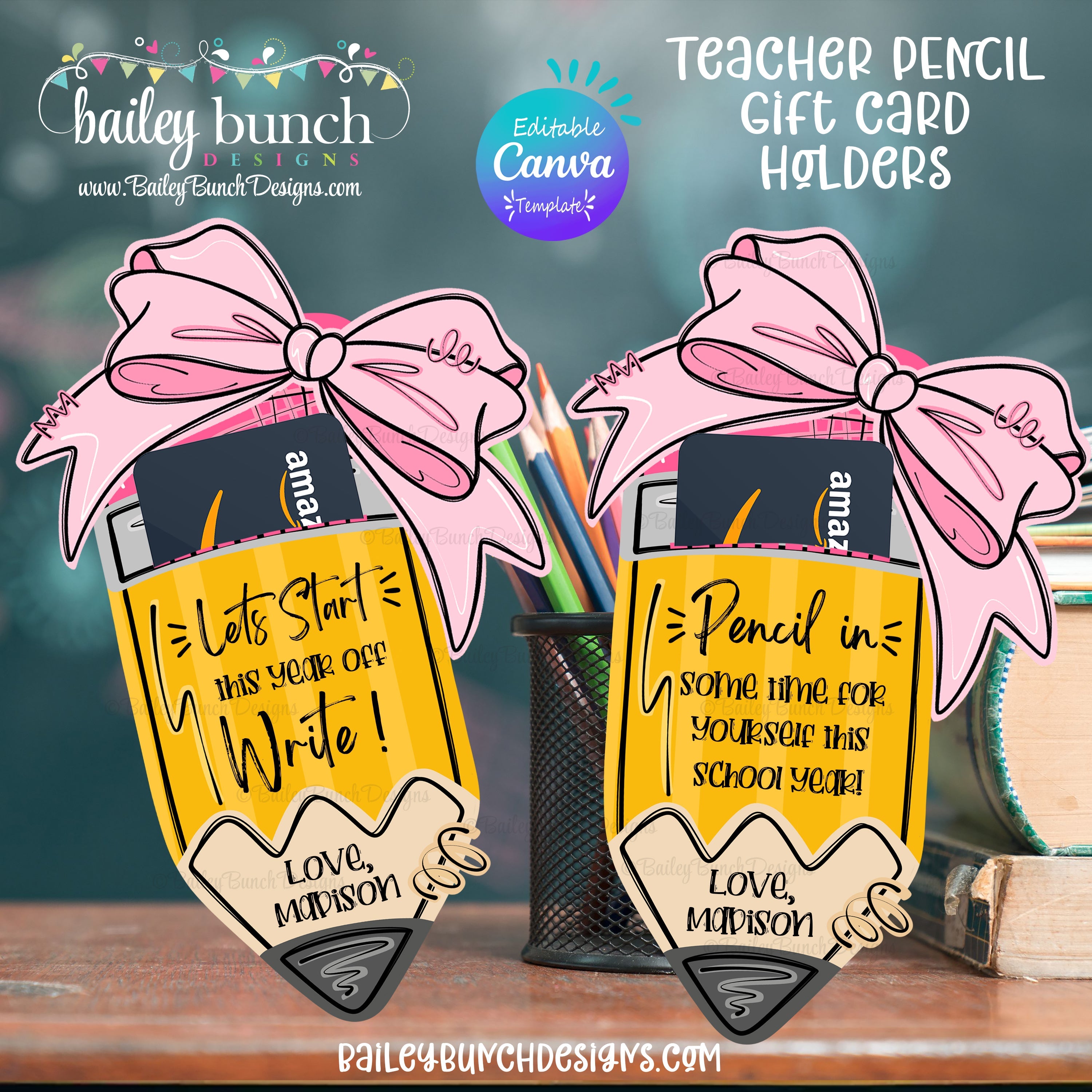 Editable Canva Template | JPG, PDF Back to School Pencil with Bow Teacher Gift Card Holder Printable | 2 Designs | JPG, PDF