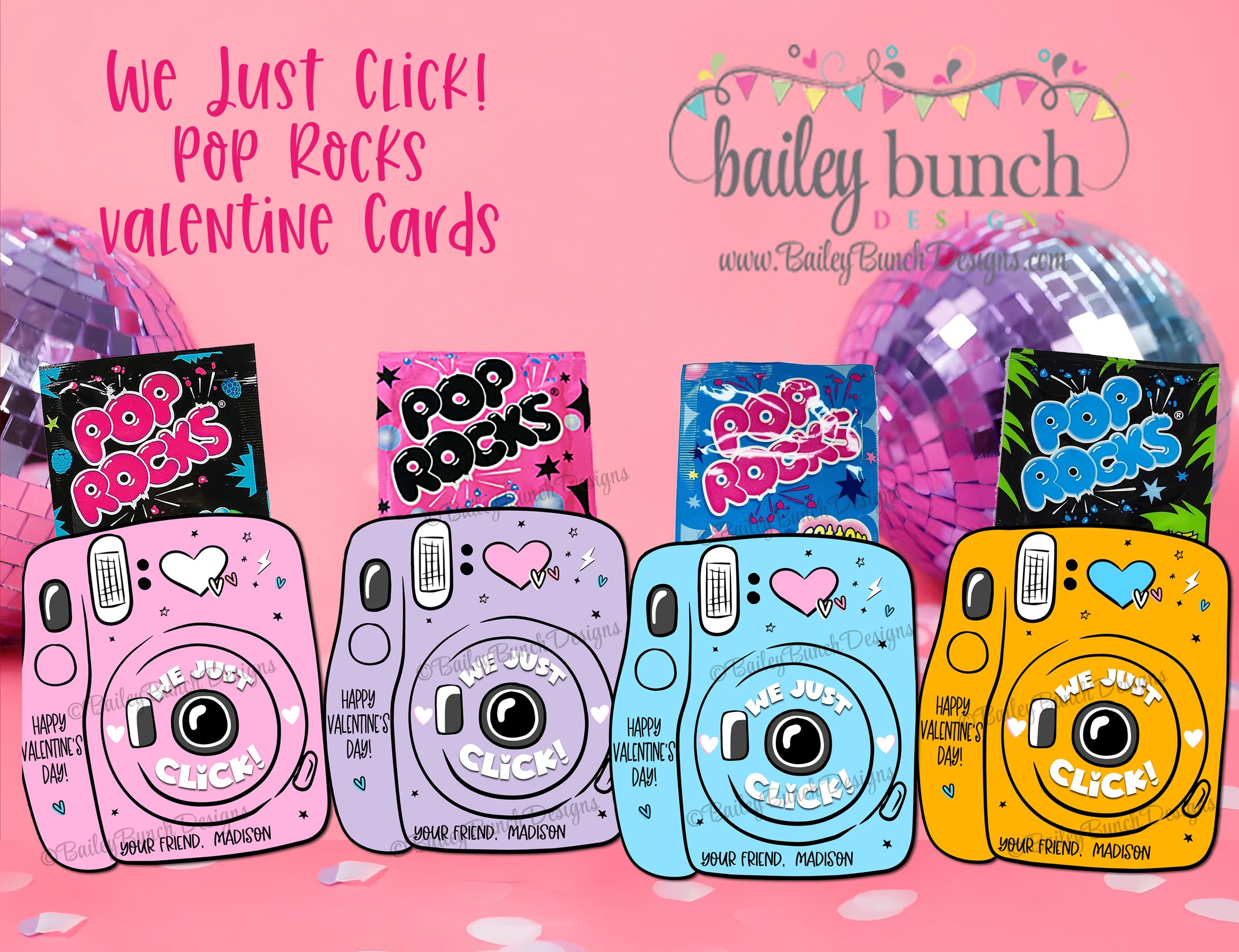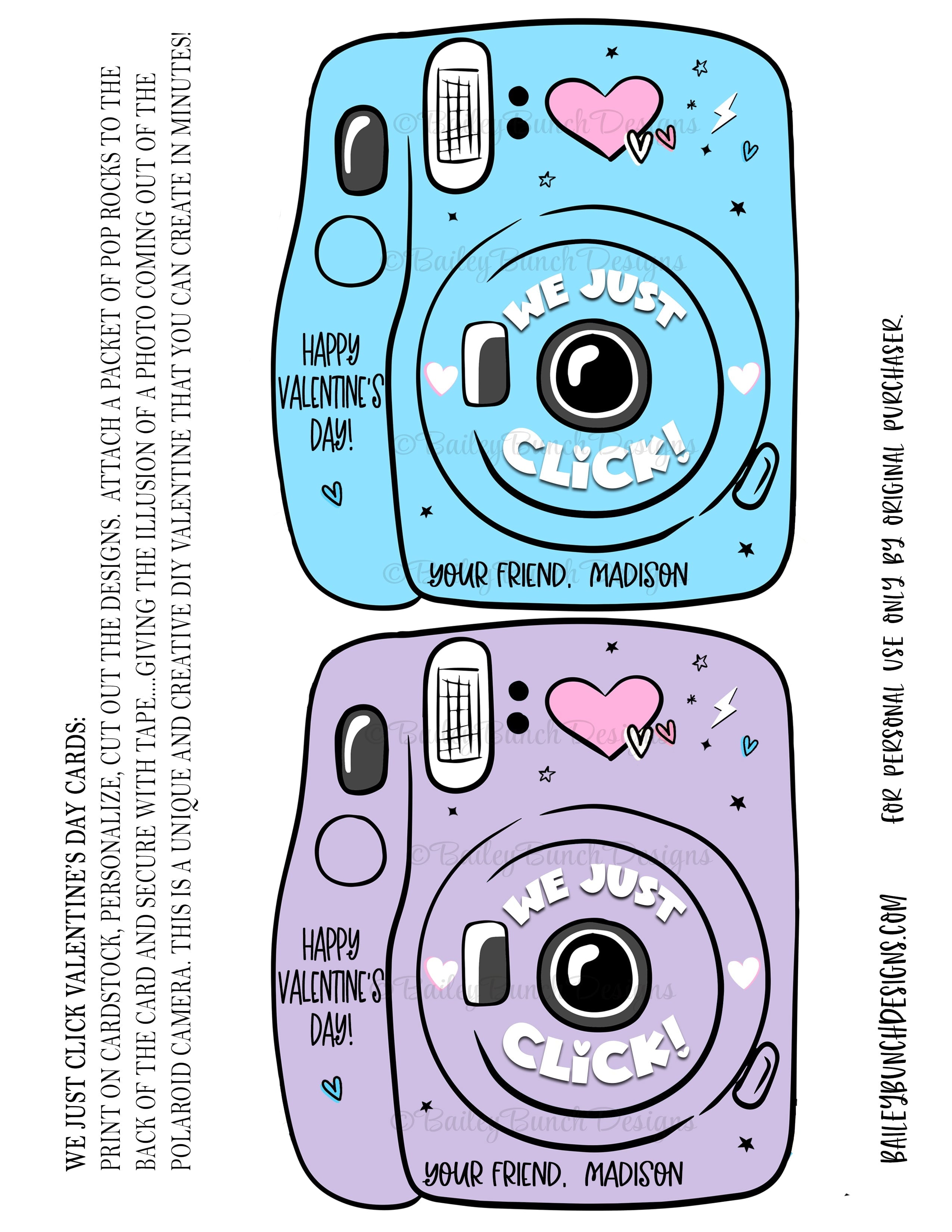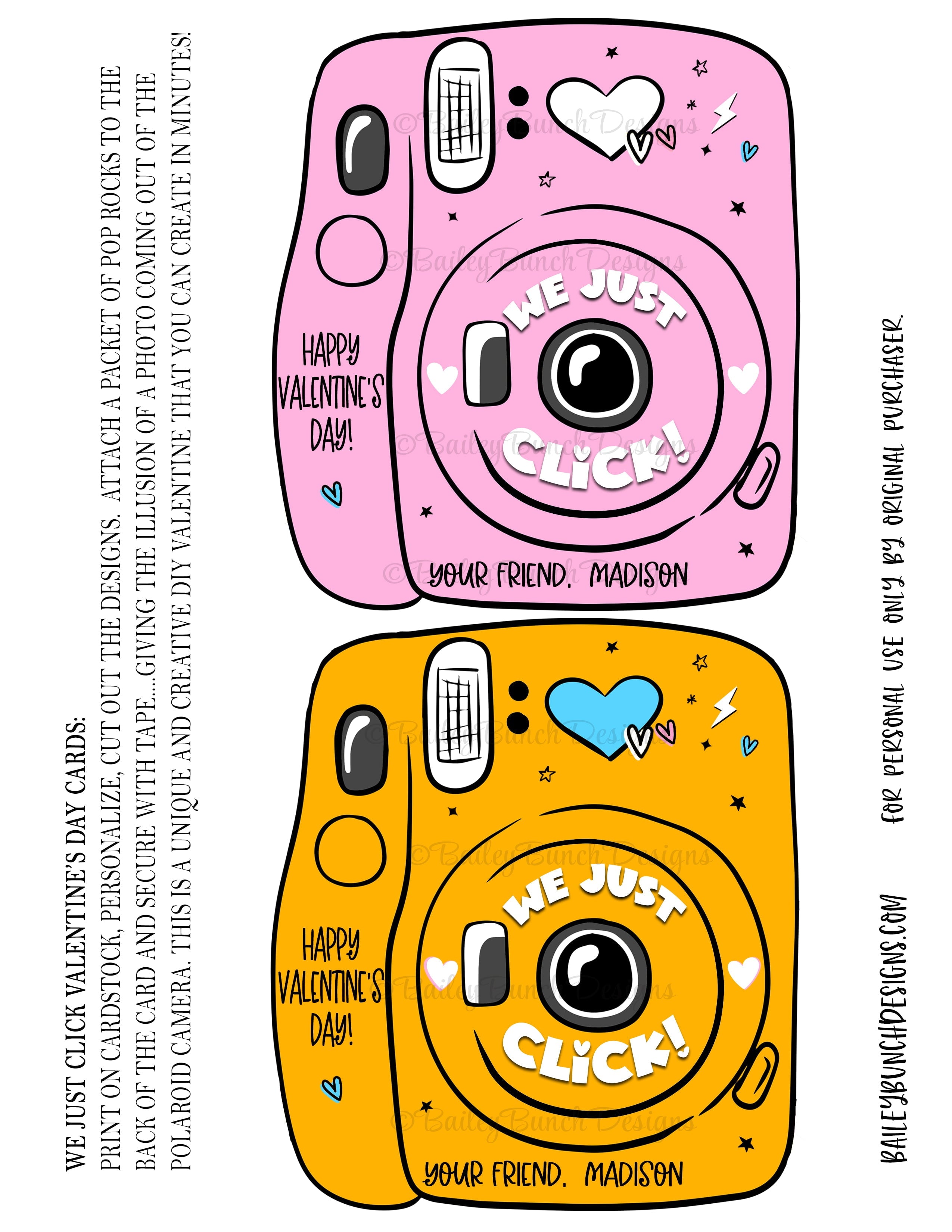 We Just Click! Looking for a super cute and easy kid's valentine? You just found it! These Instant Camera with Rainbow straps Kids Valentine Printables are too unique and fun to pass up! This kids valentine printable comes in 4 different colors. Print and attach a packet of Pop Rocks to back of card and secure with tape...giving the illusion of a photo coming out of the Polaroid camera. This is a unique and creative DIY valentine that you can create in minutes! Perfect for school and classroom Valentine's Day parties!