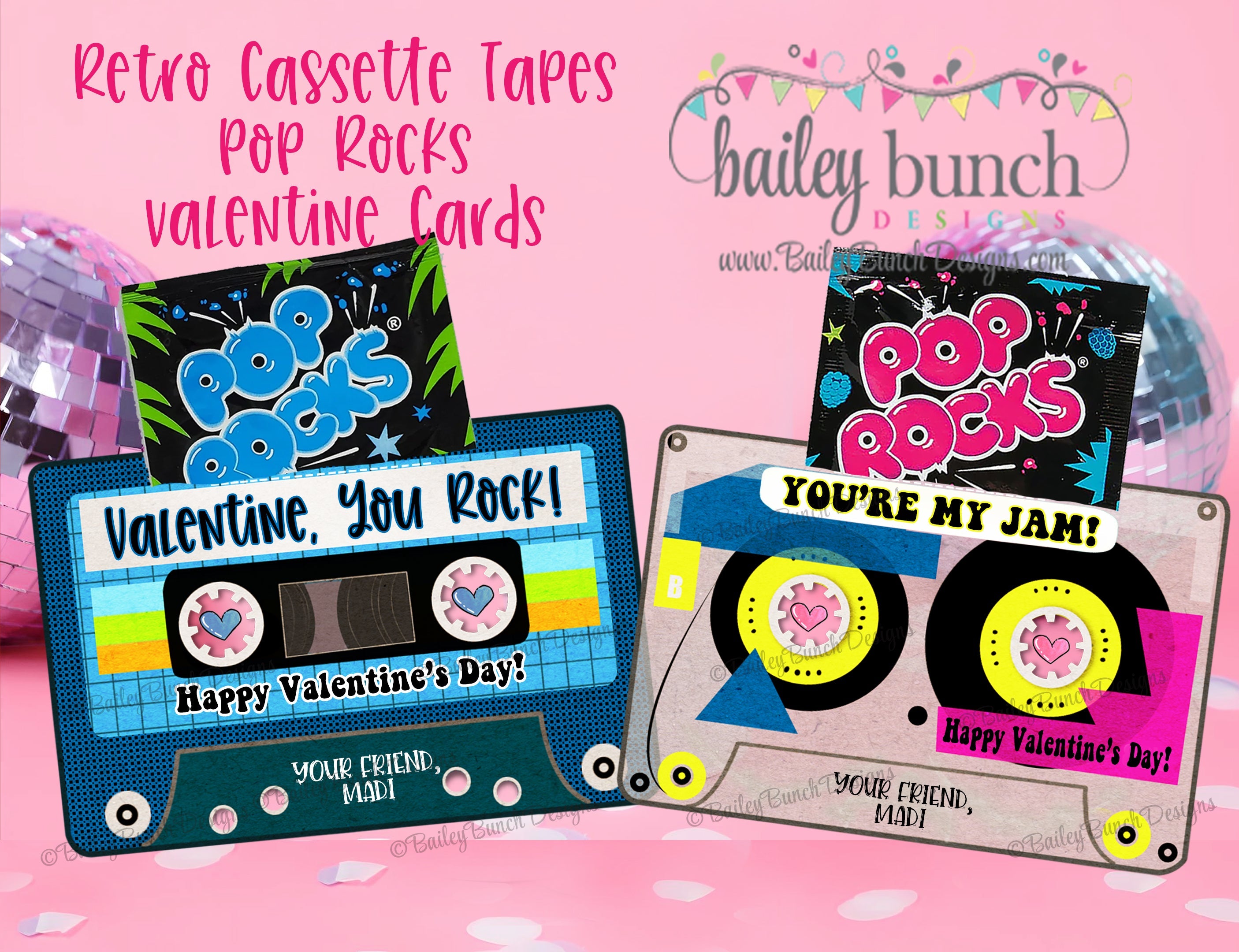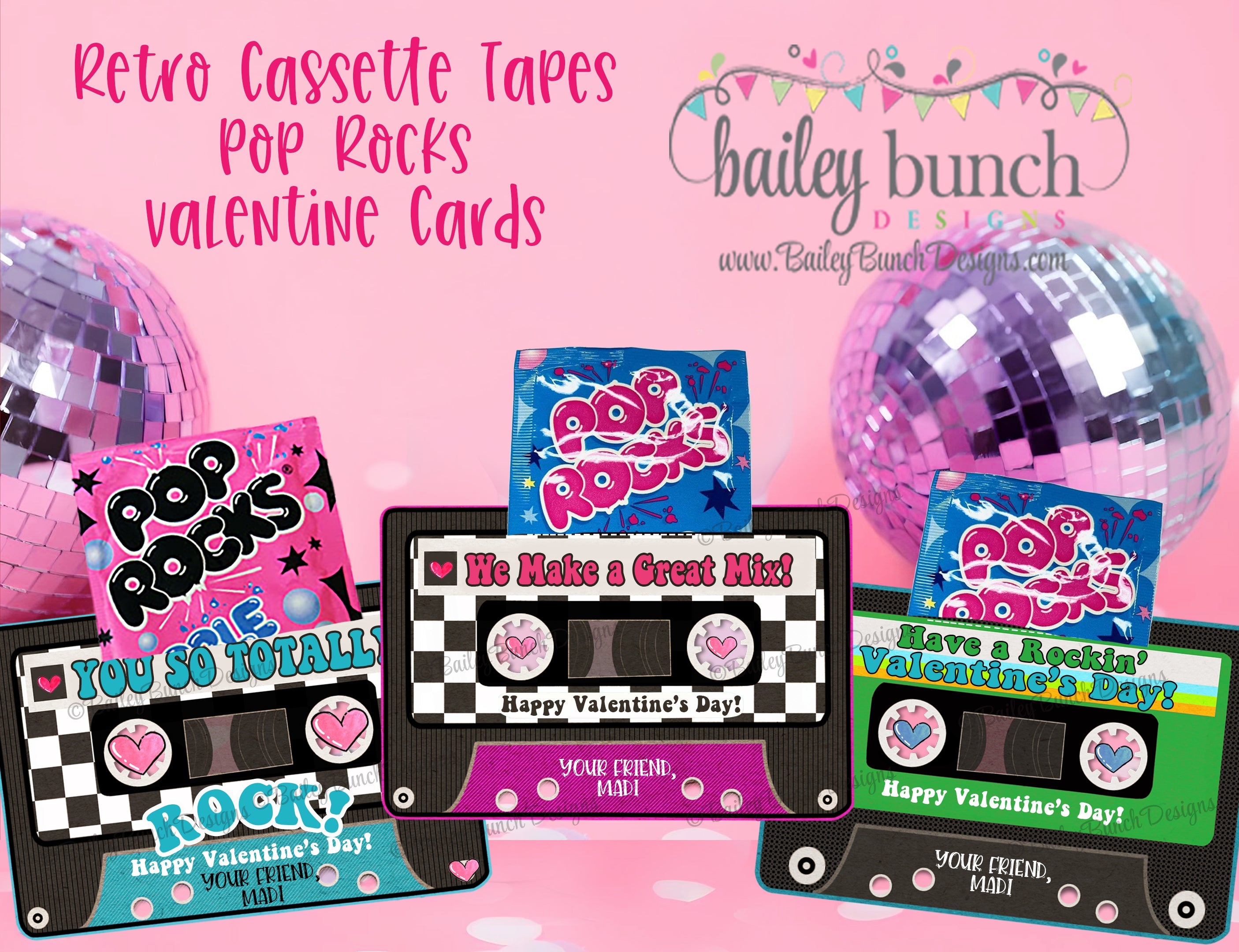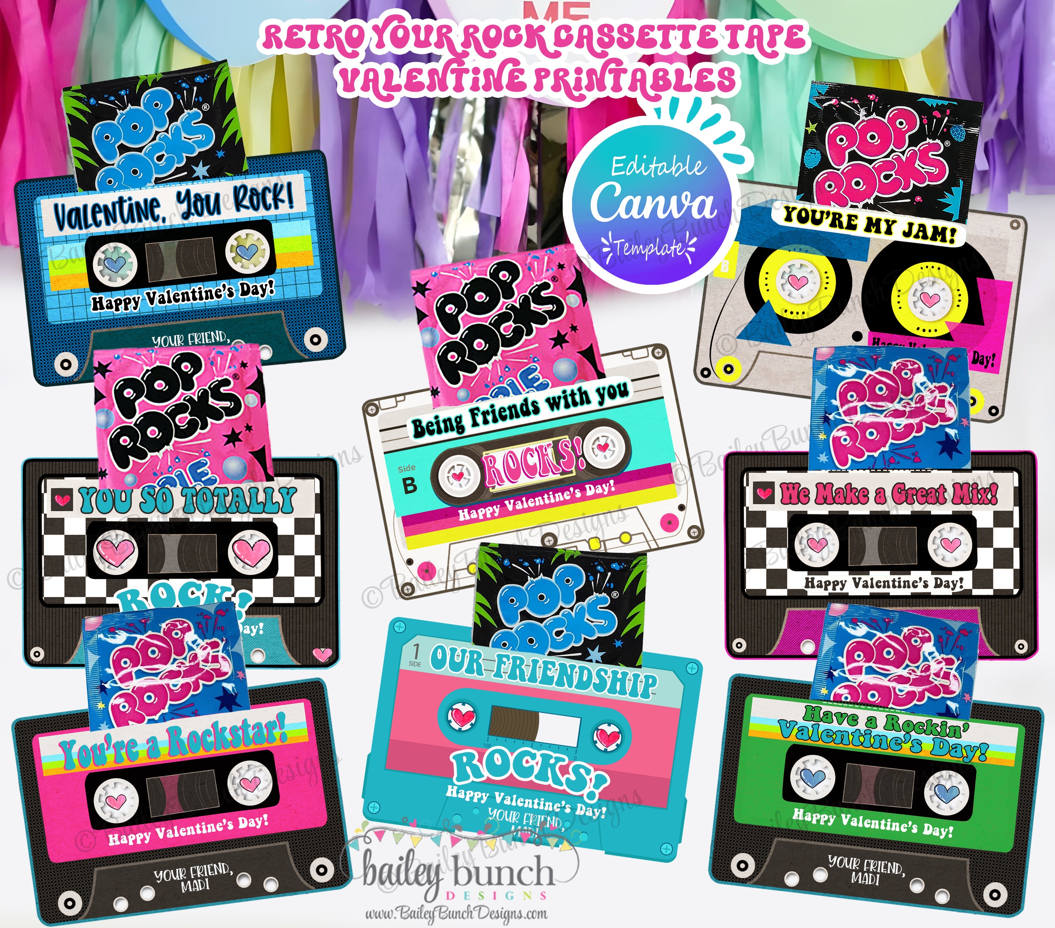 Celebrate Valentine’s Day with this adorable You Rock Retro Cassette Tape canva template Valentine's Day Cards! Pair these retro cassette valentines with pop rocks for a rockin' valentine treat kids will love. Cards print 4 per standard sheet. 8 Different designs and 8 different sayings. Print them all or choose your favorite! Print as many as you need. Nothing physical will be shipped.