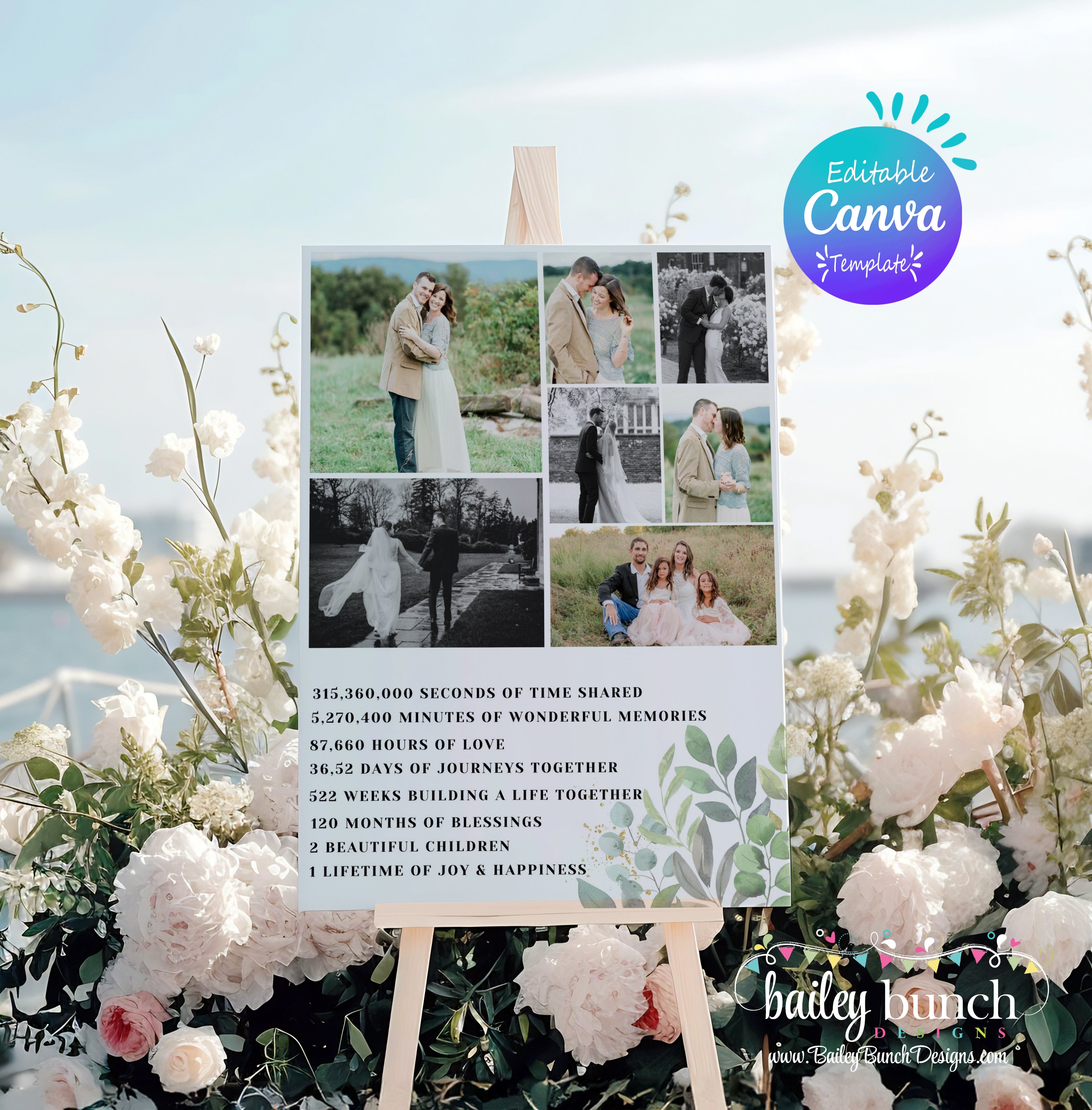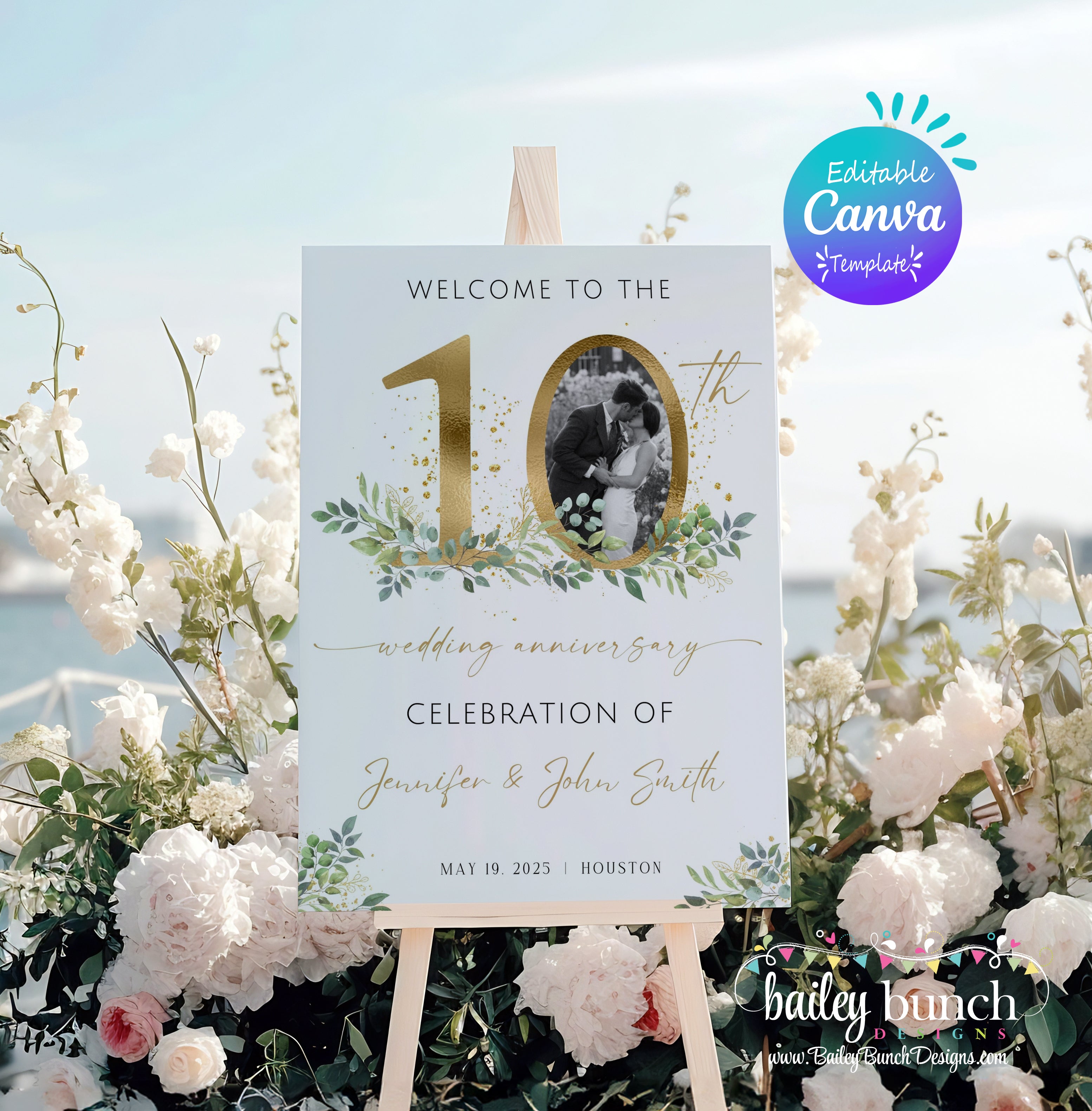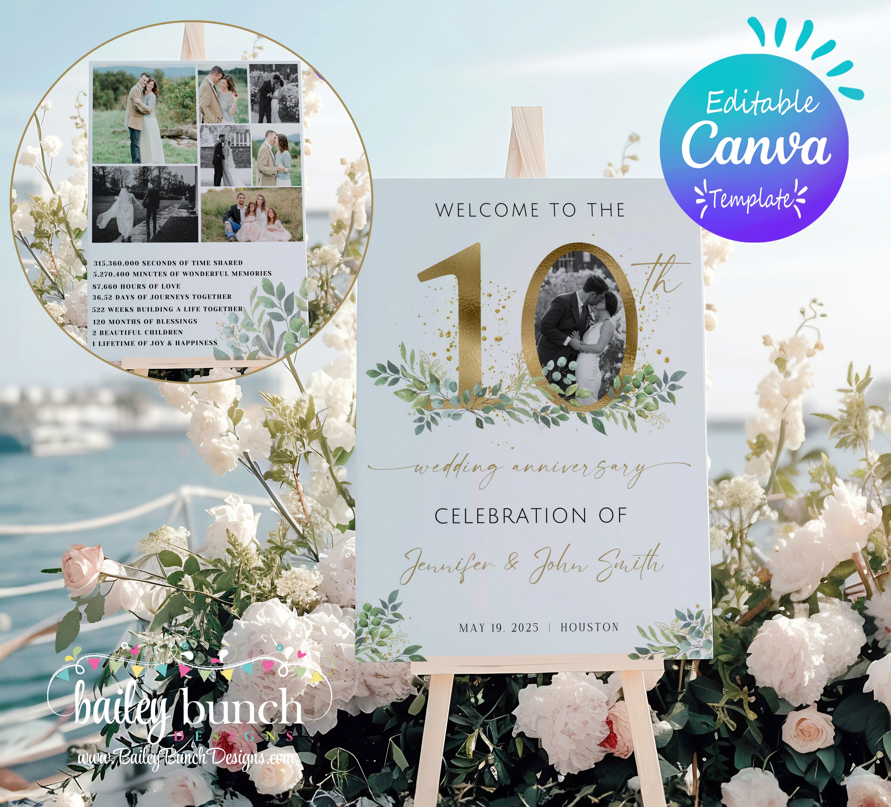 Welcome your guests in style to your 10th wedding anniversary celebration with our simple modern and minimalist Welcome Sign Templates. Super quick and easy to edit, allowing you to plan the perfect fiftieth anniversary celebration. The template is fully editable in Canva which allows you to personalize every detail, creating a customized invitation that reflects your unique taste.