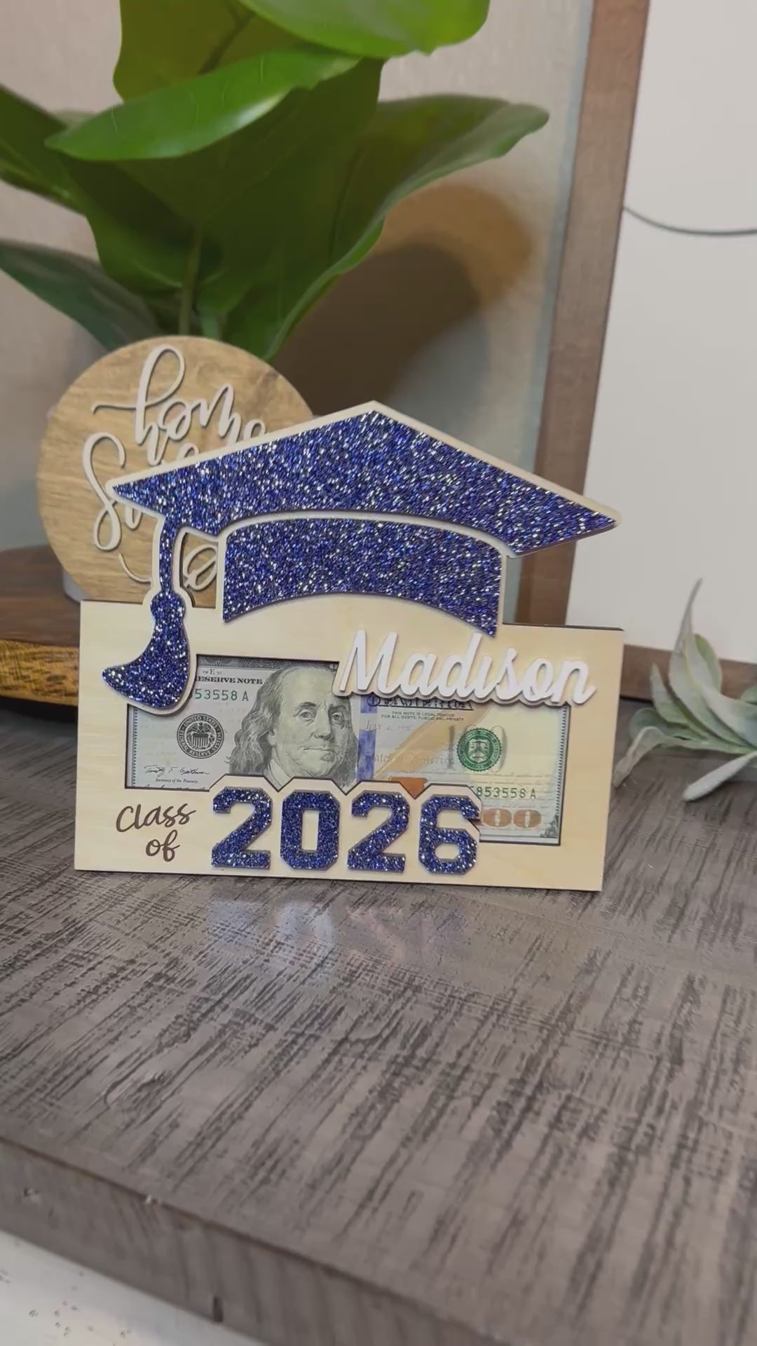 Celebrate their achievements with this beautifully handcrafted Wooden Money Holder, with Royal Blue accents. Perfect as a Graduation 2026 Gift for Her or Graduation Class of 2026 Gift for Him. Each piece is carefully laser-cut, making it a one-of-a-kind Personalized Graduation Money Holder that holds cash or gift cards in style.