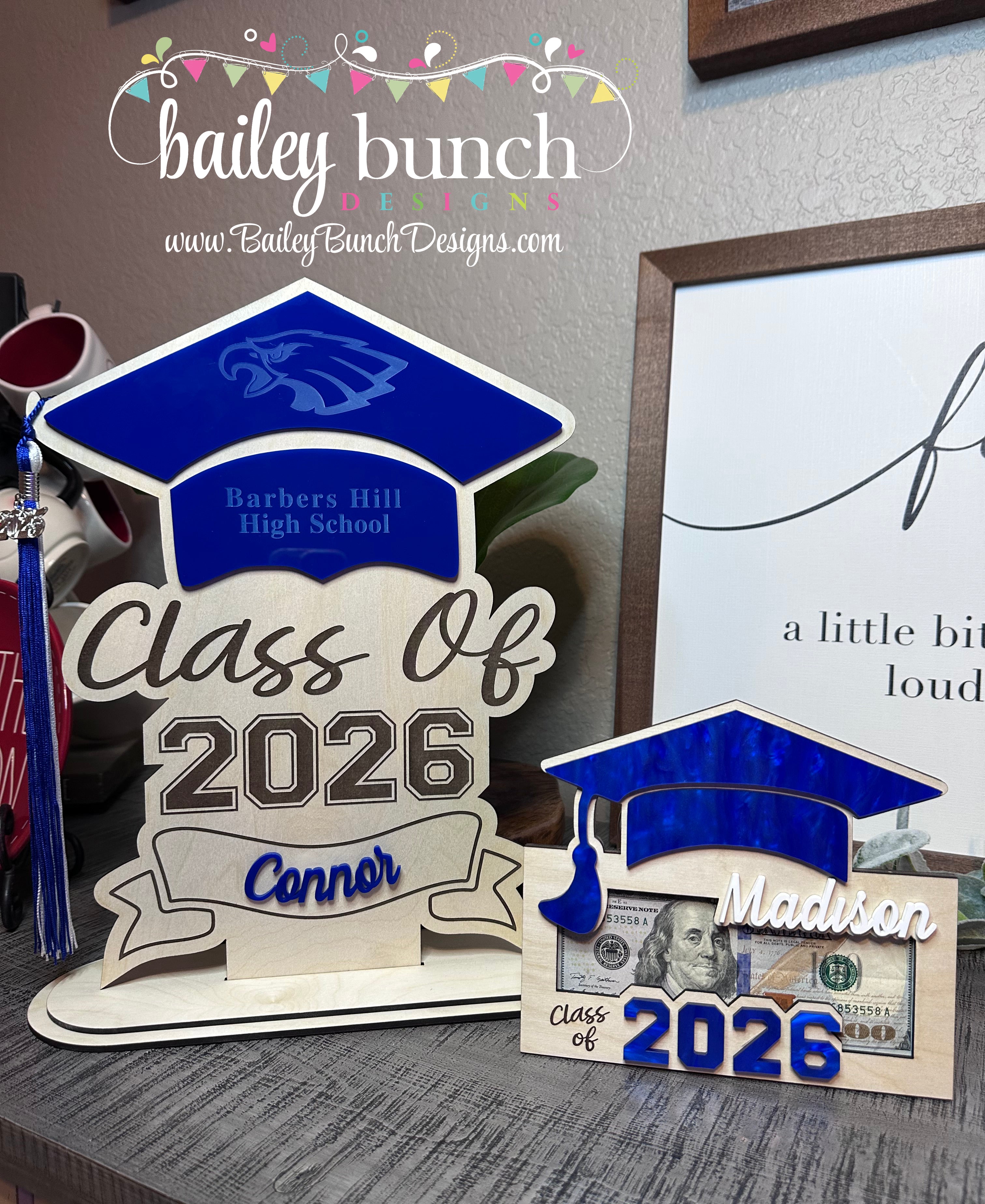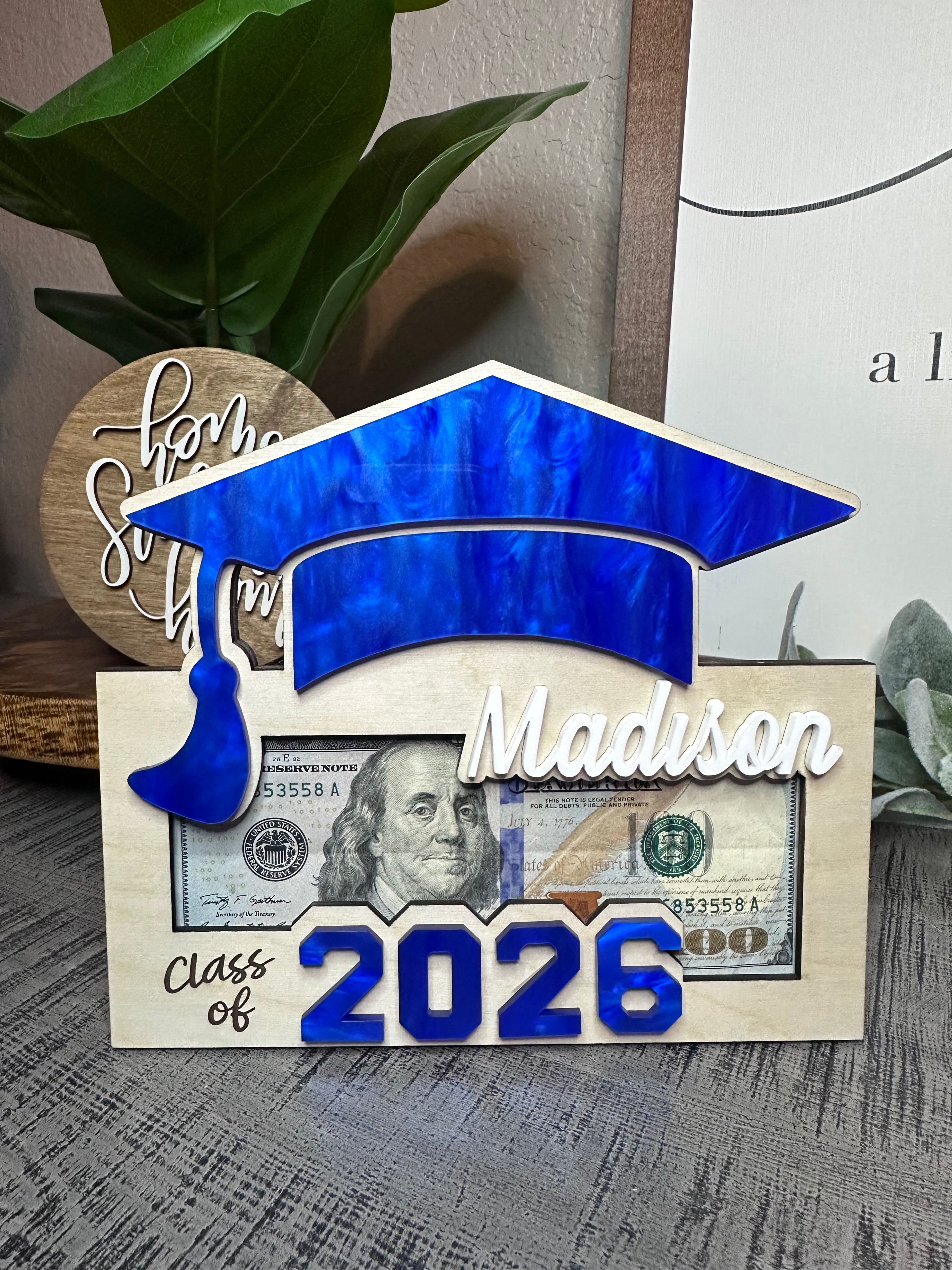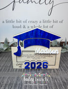 Celebrate their achievements with this beautifully handcrafted Wooden Money Holder, with Royal Blue accents. Perfect as a Graduation 2026 Gift for Her or Graduation Class of 2026 Gift for Him. Each piece is carefully laser-cut, making it a one-of-a-kind Personalized Graduation Money Holder that holds cash or gift cards in style.