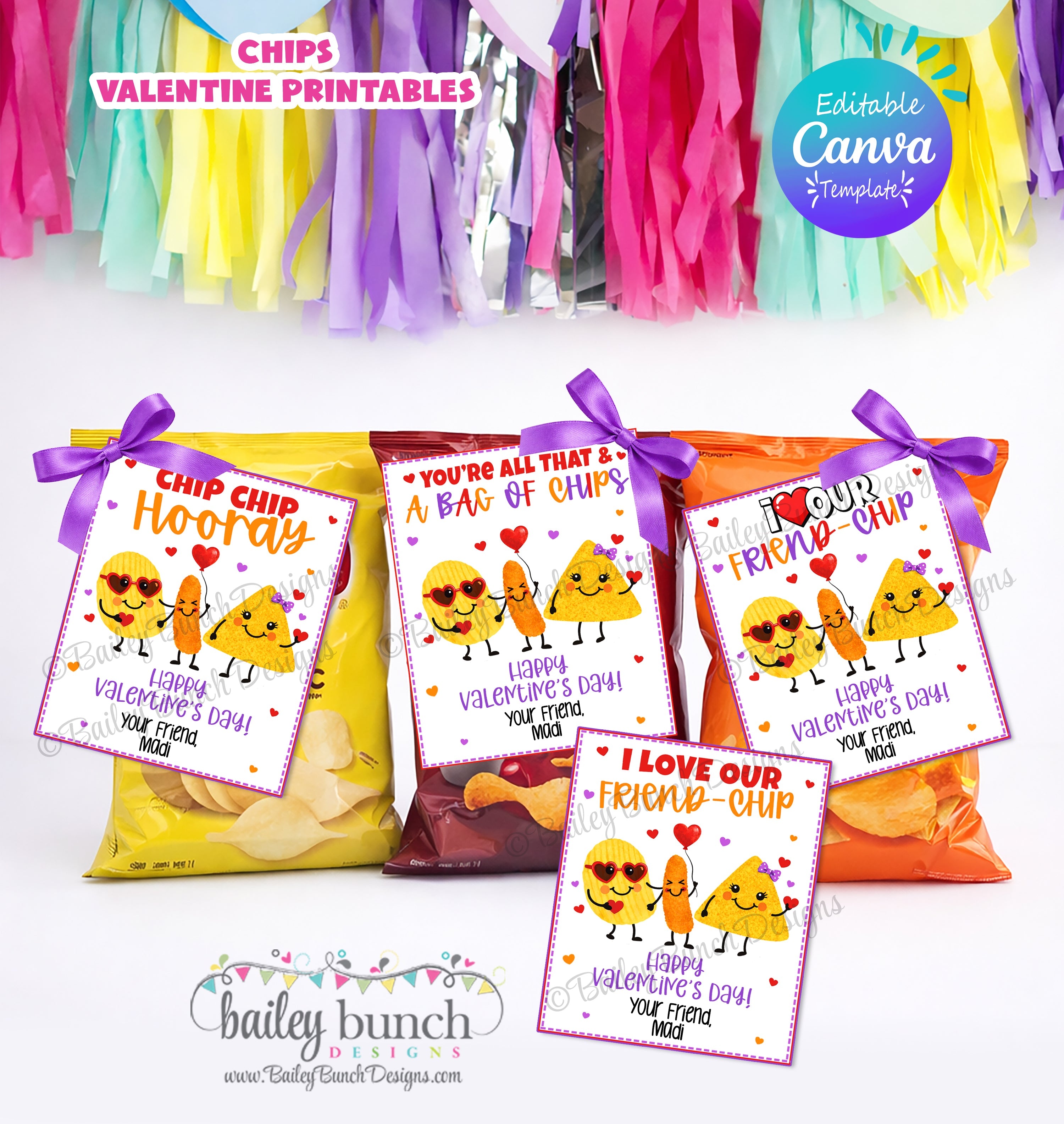 To assemble, personalize by adding your name in Canva, print on cardstock and cut out the designs. Attach tag to snack size chips for a unique and creative DIY Valentine in minutes!