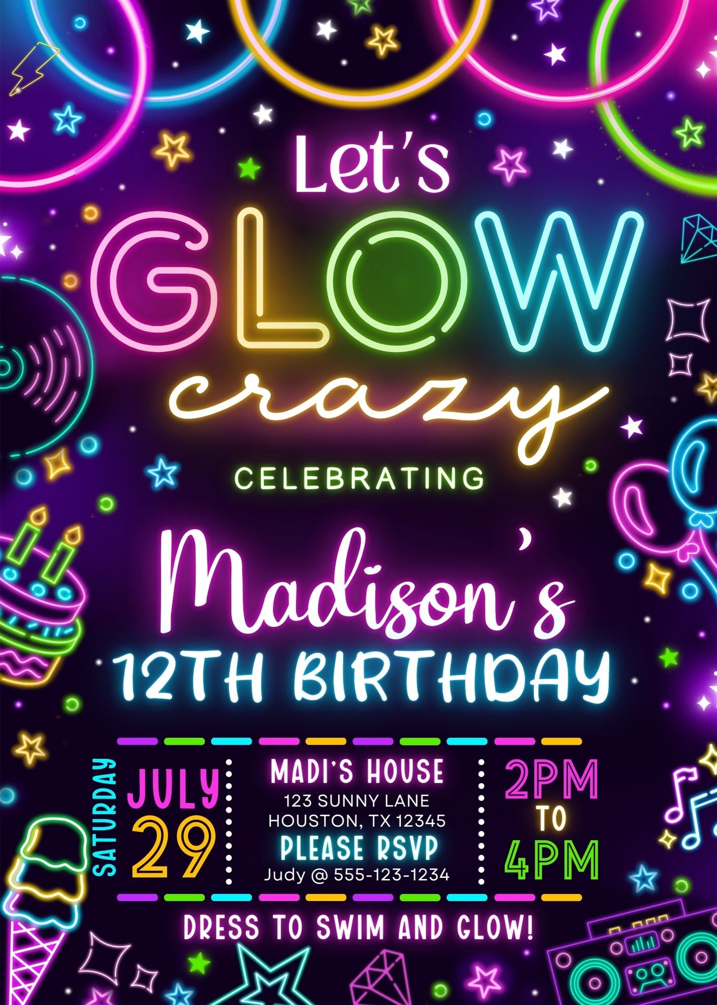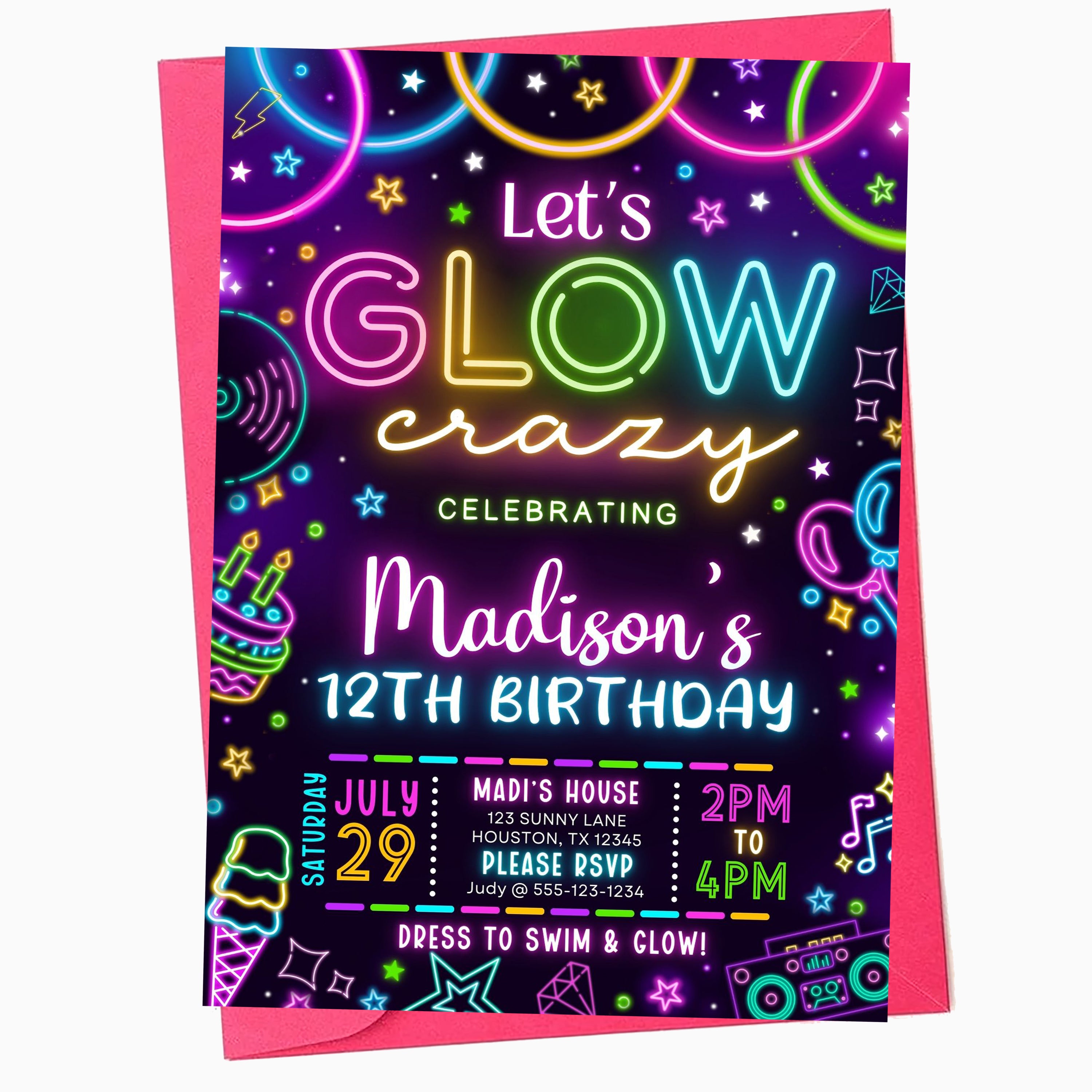 Editable Glow Party Birthday Invitation, Glow Invitation, Glow Crazy Birthday Invitation, 5x7 & 4x6 Invites