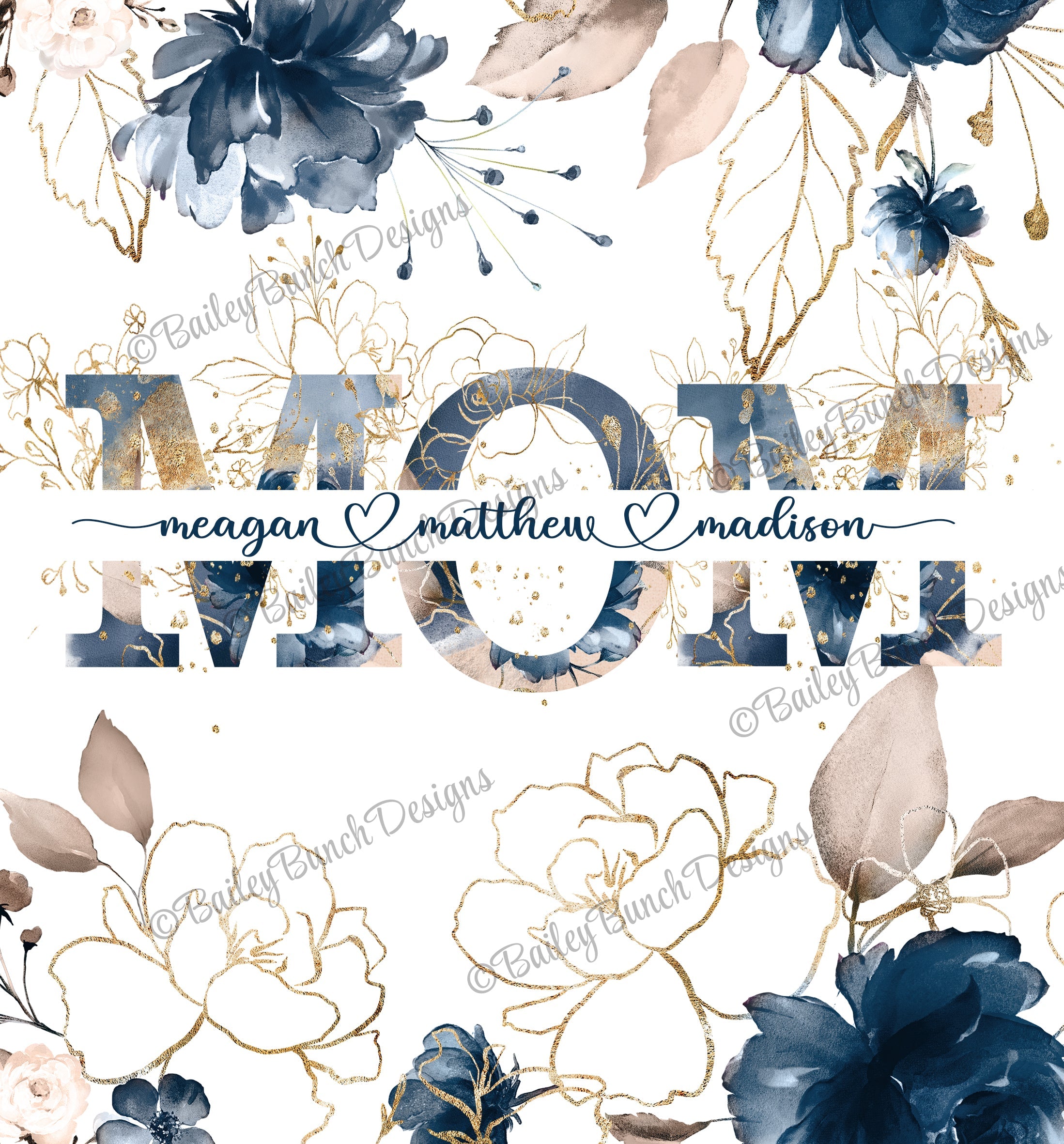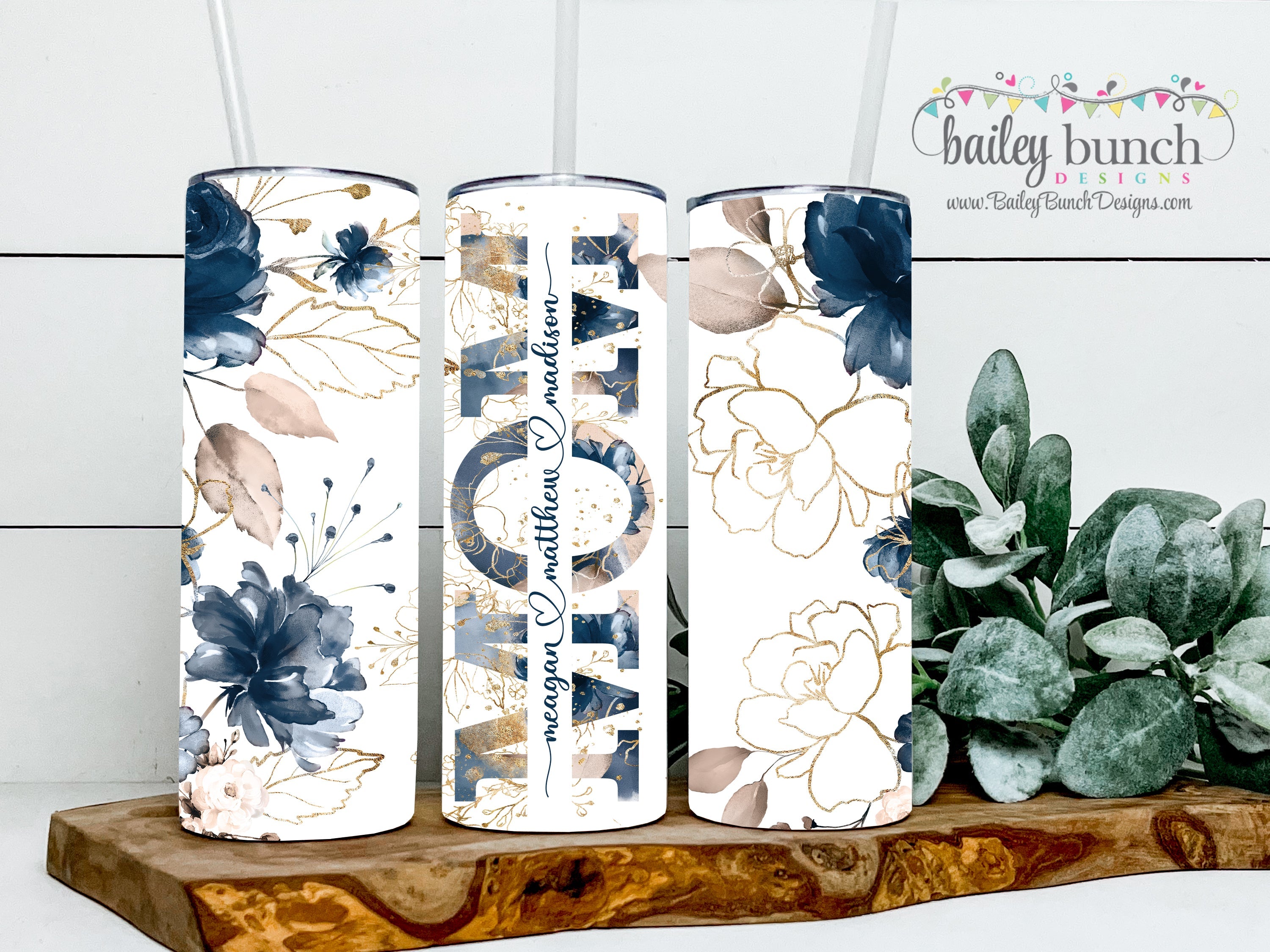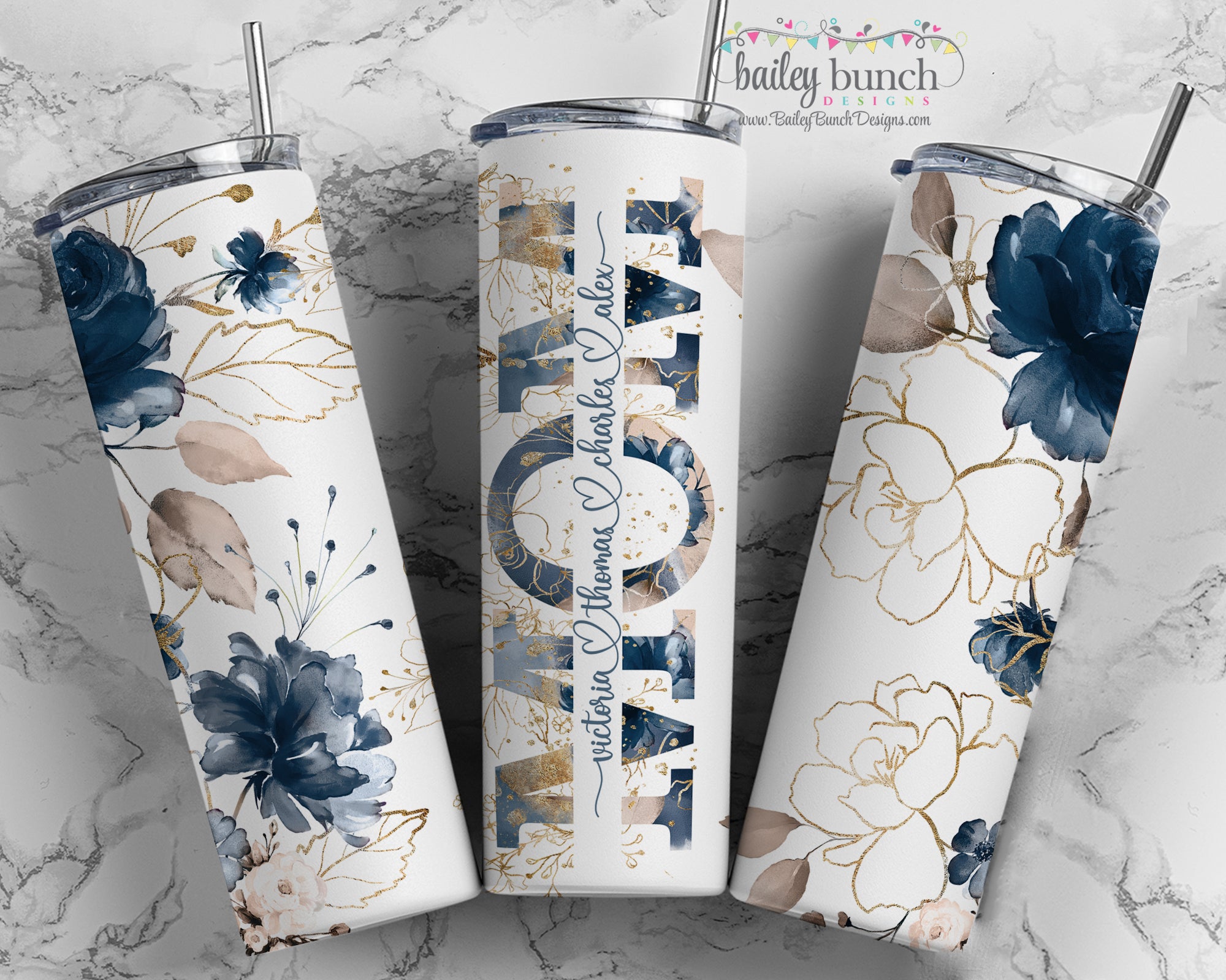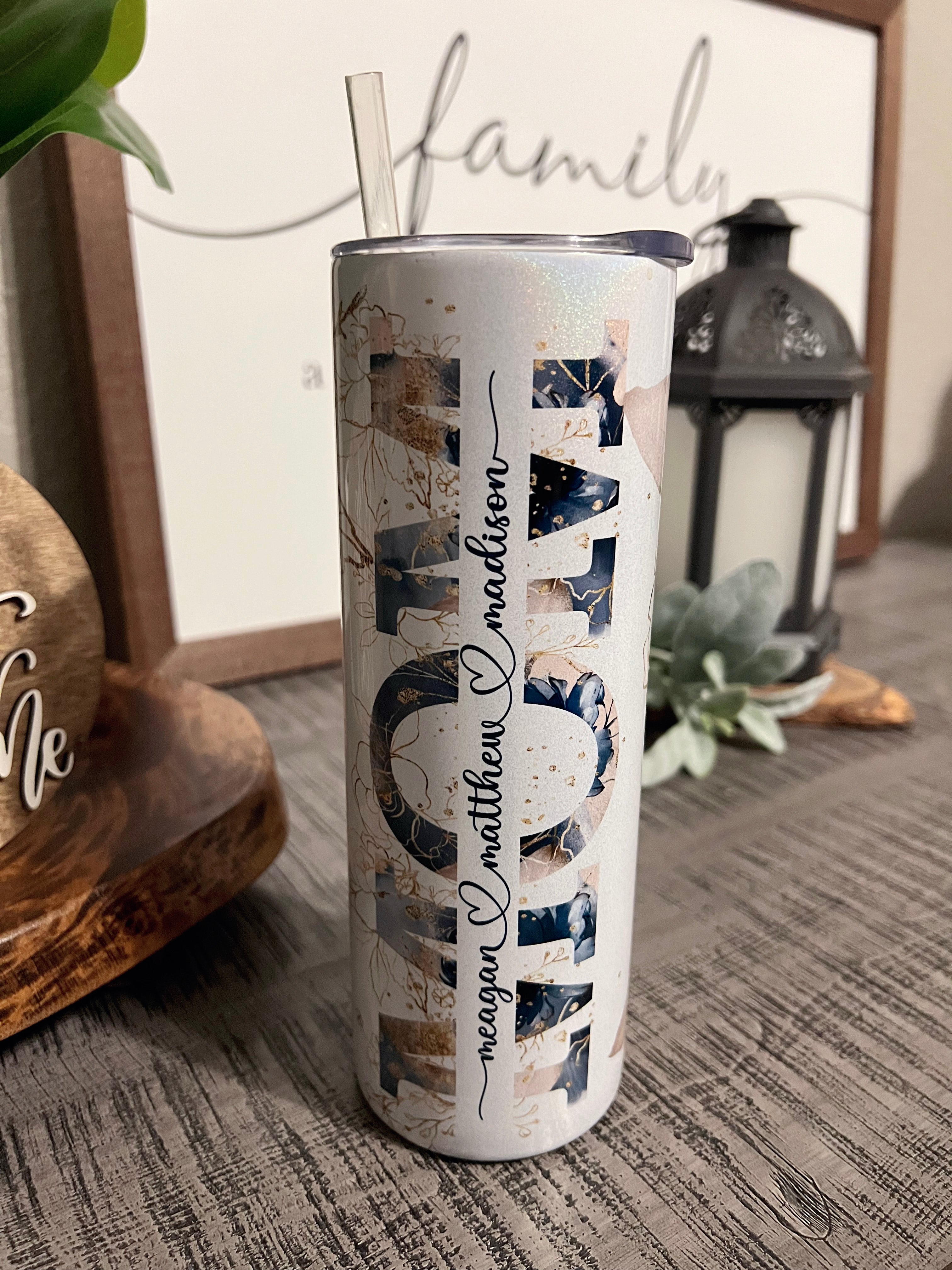 MOM BLUE FLORAL WITH NAMES GLITTER TUMBLER!
