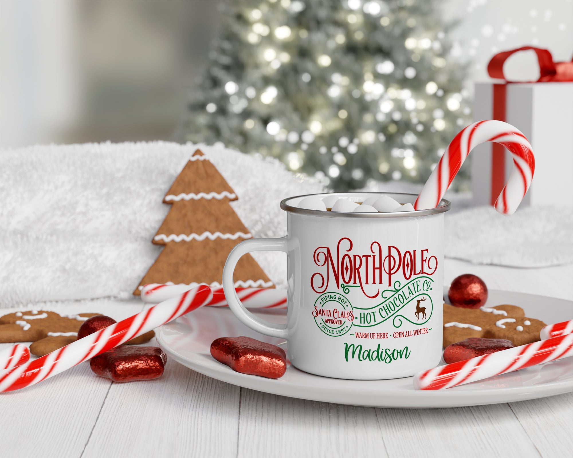 Help bring the magic of Christmas to your child with our adorable North Pole Hot Chocolate Personalized Mug!