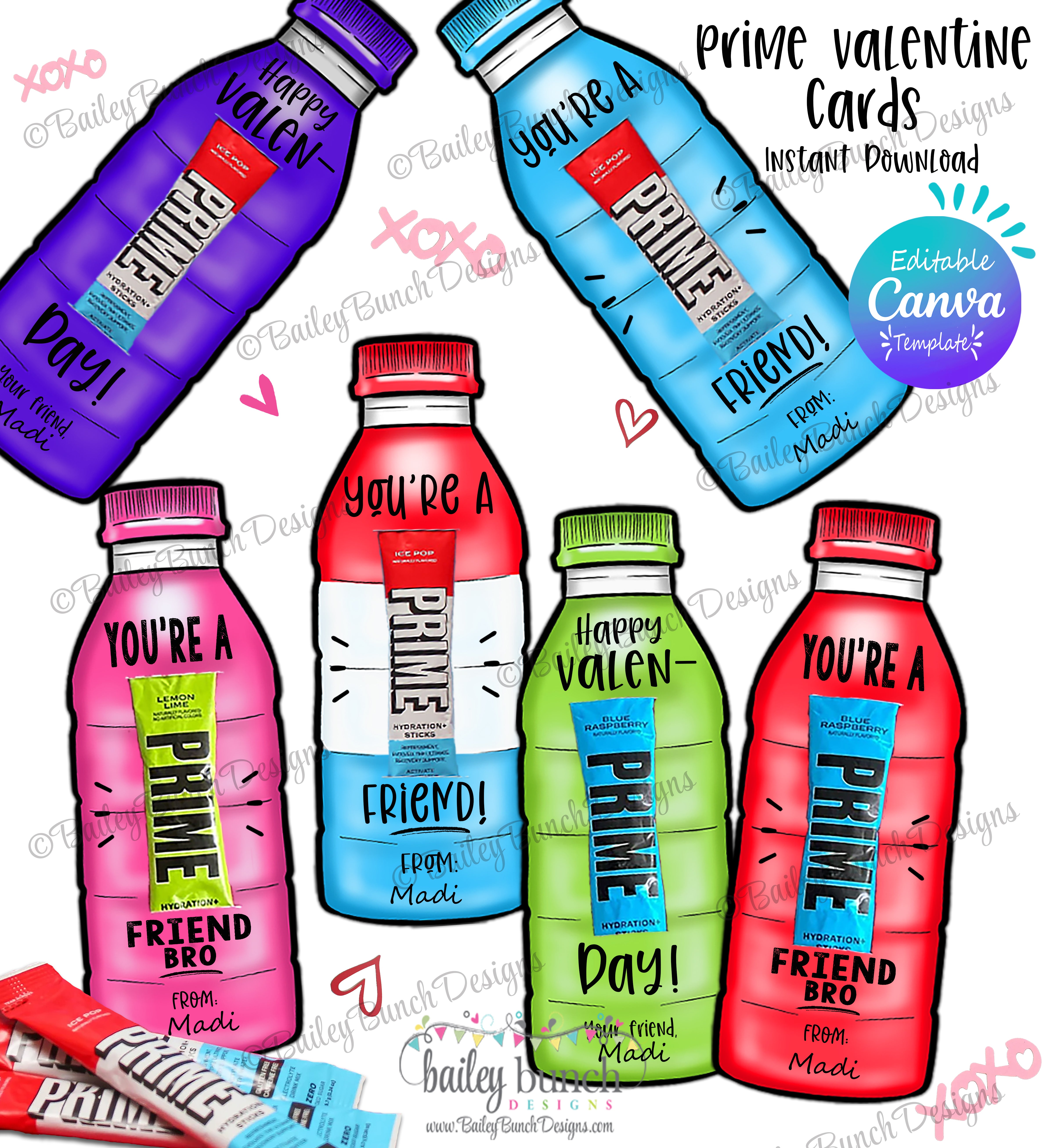 This CANVA TEMPLATE Printable is super fun and easy kid's valentines are perfect for a classroom Valentines party gifts/cards for boys or girls! Just print, cut out and add a Prime Drink mix! Comes with six different drink colors. Green, Pink, Blue, Purple, Red and Rainbow.