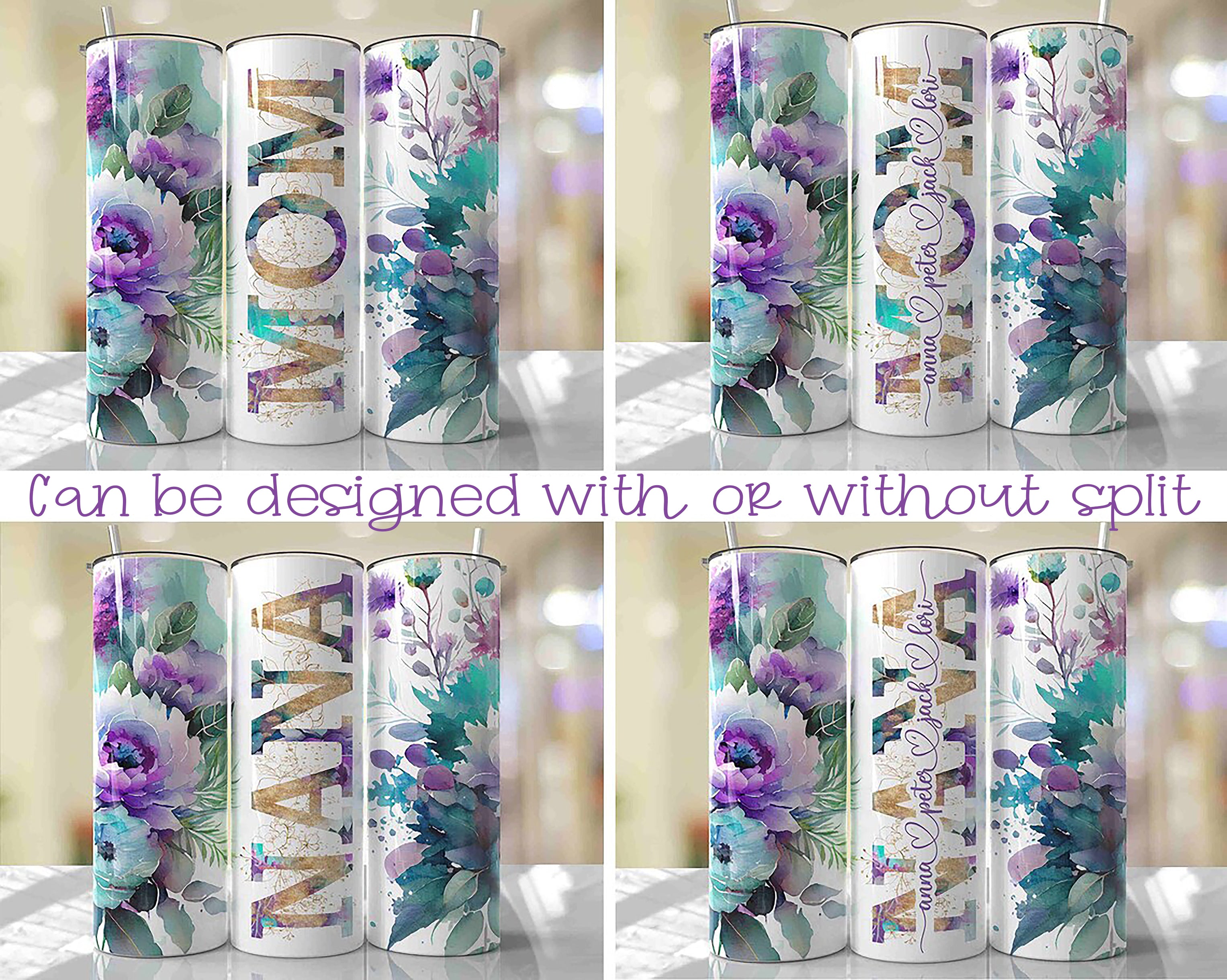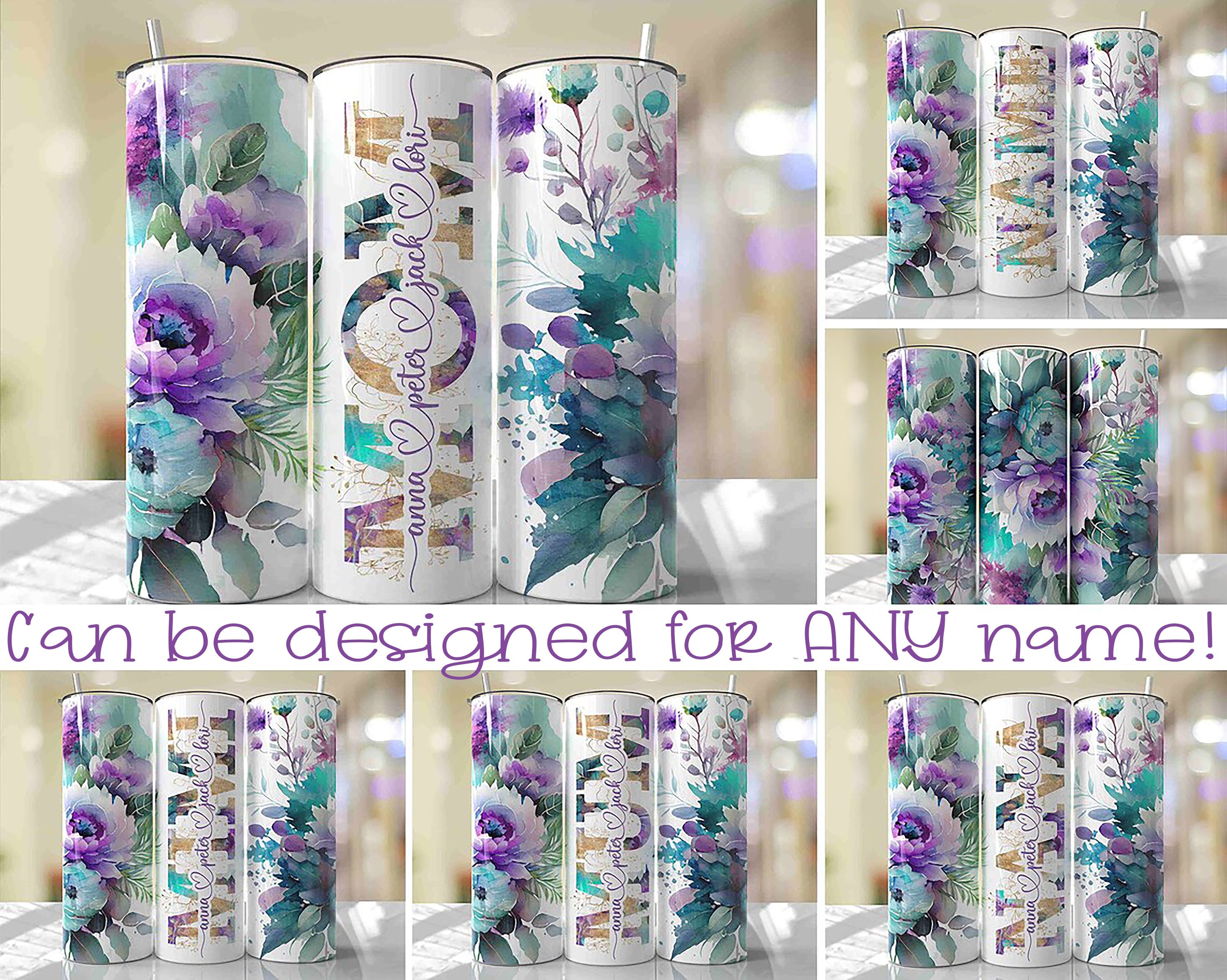 PURPLE & TEAL FLORAL WITH NAMES GLITTER TUMBLER!