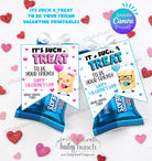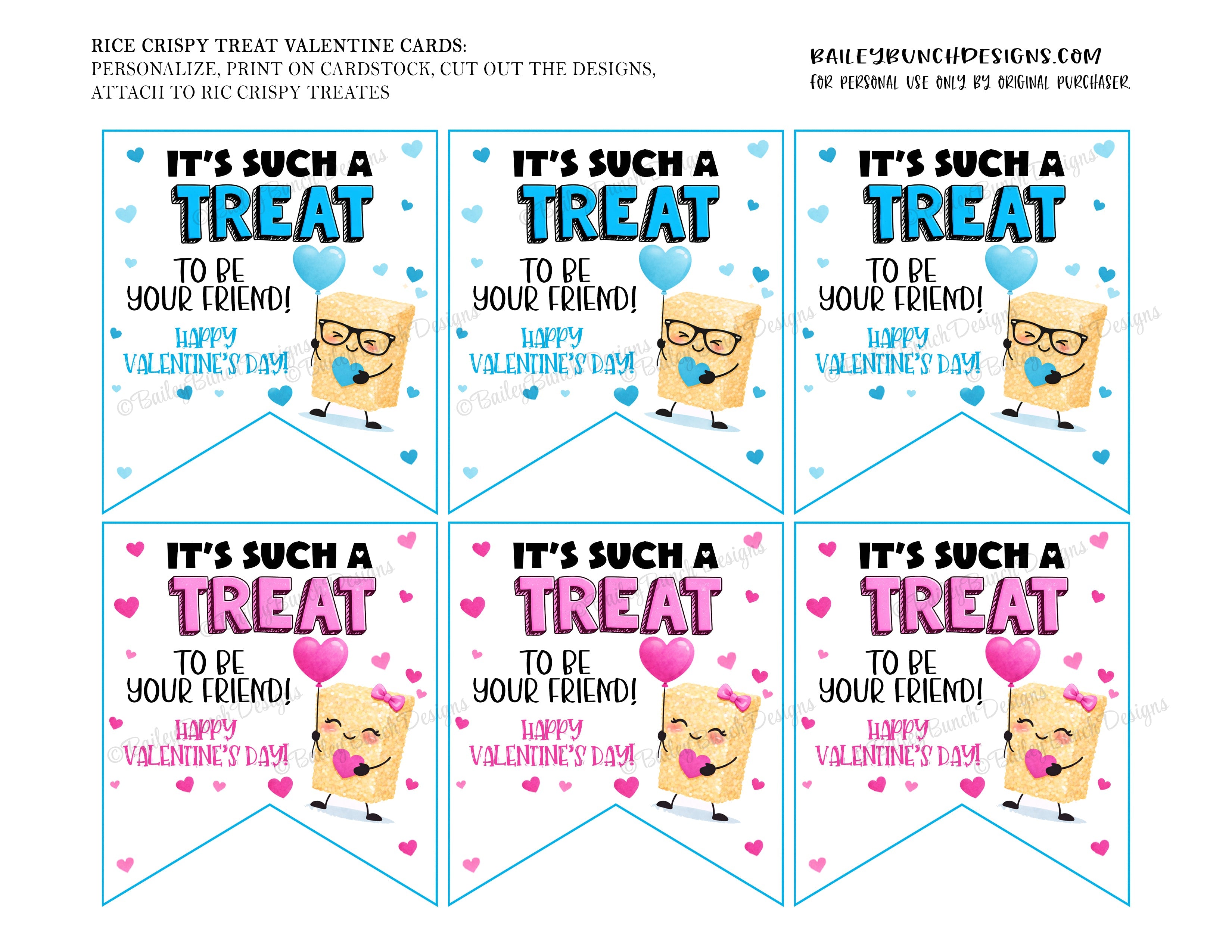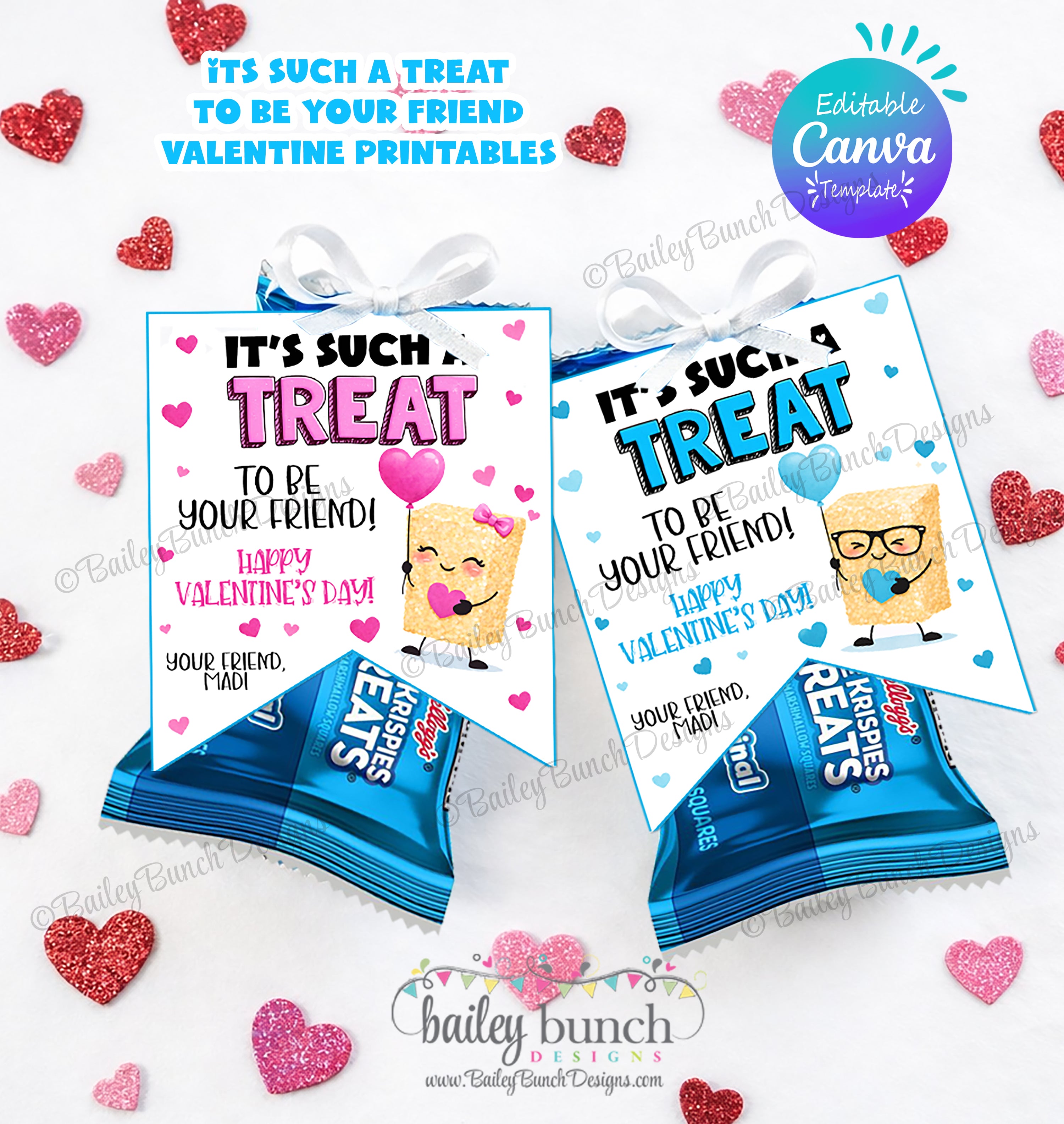To assemble, personalize by adding your name in Canva, print on cardstock and cut out the designs. Attach tag to rice crispy treats for a unique and creative DIY Valentine in minutes!