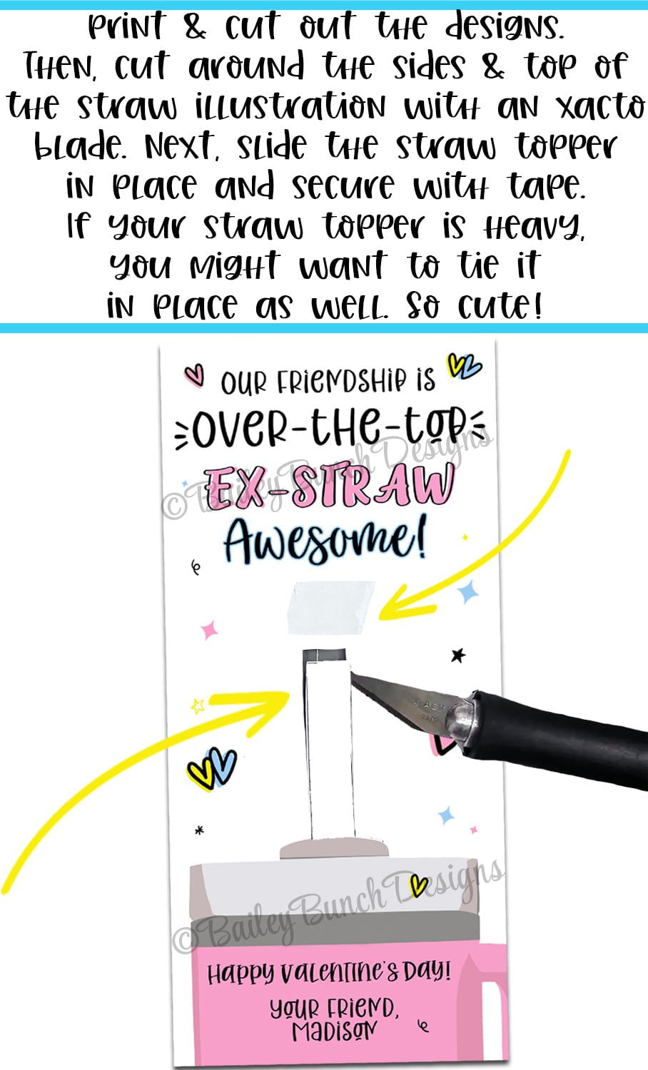 Personalized, Print, and cut out the cards. Then, cut around the sides and top of the straw image with an xacto blade. Next, slide the straw topper in place and secure with tape. If your straw topper is heavy, you might want to tie it in place as well. So cute!